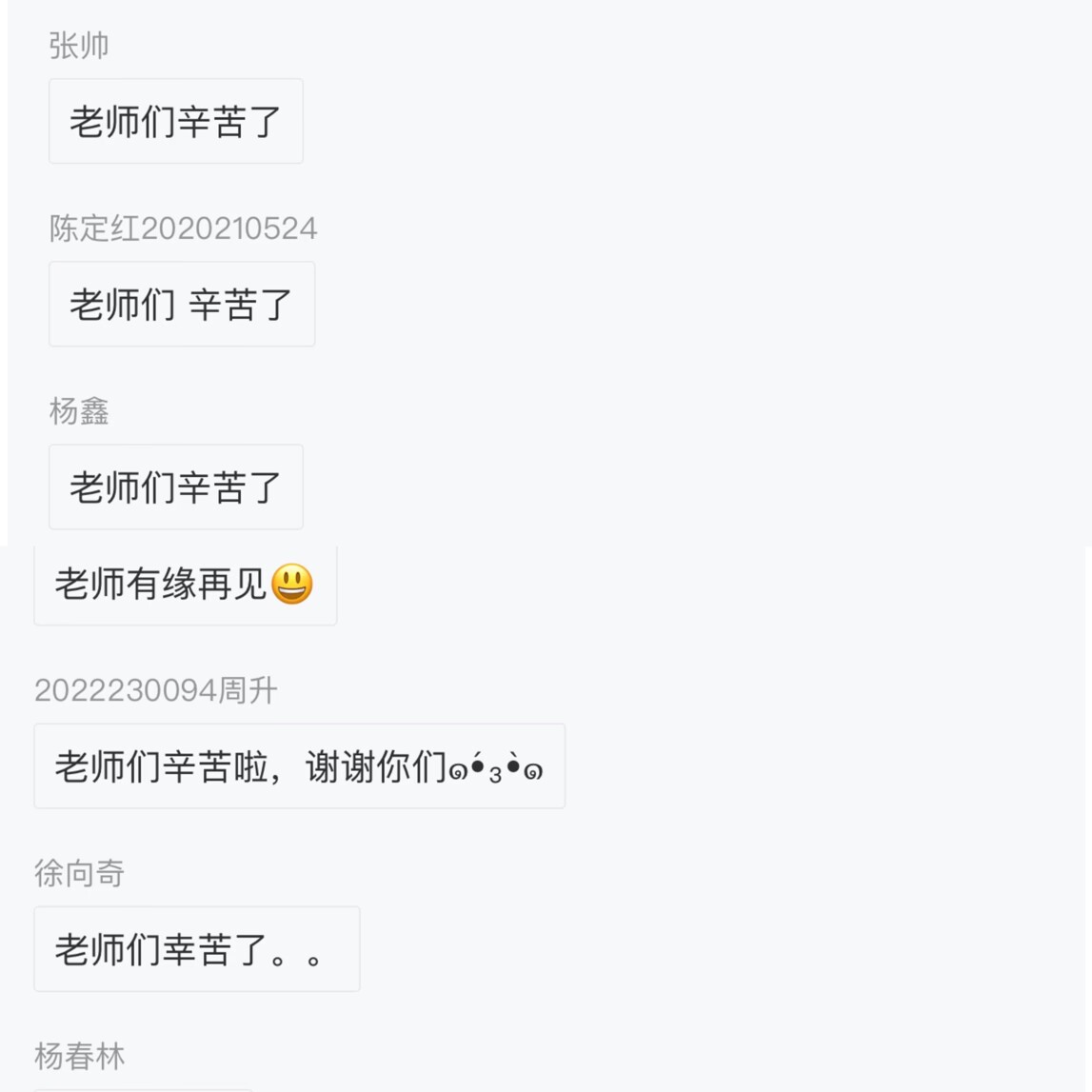 会议最后,院长李文娟对本次座谈会进行总结讲话:“学院非常重视座谈会中同学们提出的意见和建议,对于同学们提出的相关问题,学院老师将尽全力快速高效解决。同时希望学生代表们也能及时收集同学们的问题、需求和老师们面对面沟通交流;在日常生活学习中希望大家能与辅导员及时交流沟通,以便于开展后续教学座谈会,为大家的学习生活创造出更加良好的环境。”最后,同学们与老师线上热情互动答疑解惑,就其他还未解答的问题进行交流,李院长表示在这段艰难又特殊的时期,需要我们同心协力共渡难关,我们所有老师都投身一线尽全力保障大家能吃饱吃好,保障大家的需求。不管有多难,只要我们在努力,一切都会过去的。学生表示充分信任学校,感受到来自老师和满满的爱,并用文字表达着自己的感恩之情。
