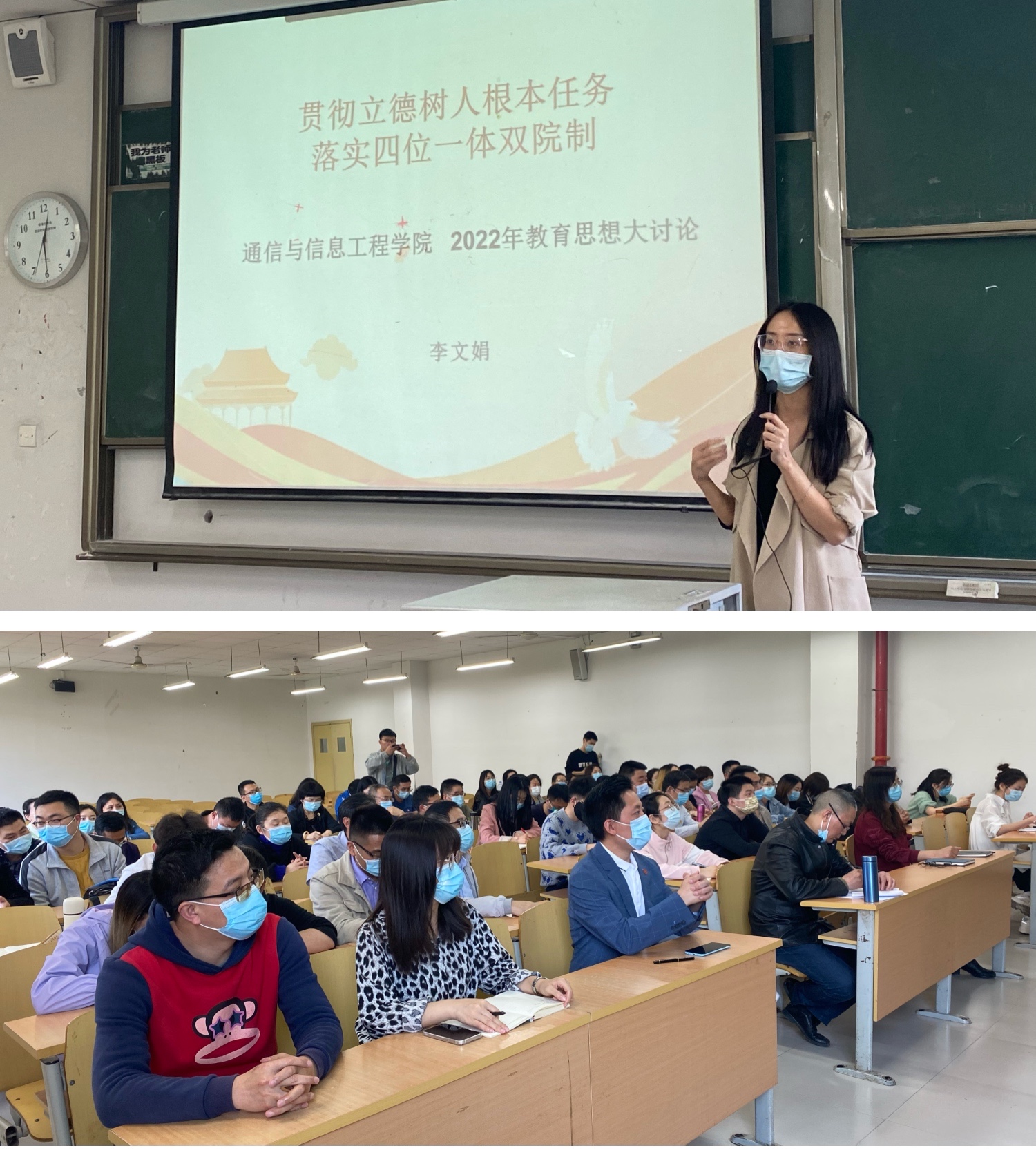 为切实开展2022年教育思想大讨论工作,根据《通信与信息工程学院2022年教育思想大讨论工作实施方案》相关安排,4月20日下午,通信与信息工程学院在4301教室开展了以“贯彻立德树人教育理念,落实四位一体双院制”为主题的大讨论活动。此次活动由通信与信息工程学院李文娟院长、唐林建副院长主讲,学院全体教师参与讨论。
