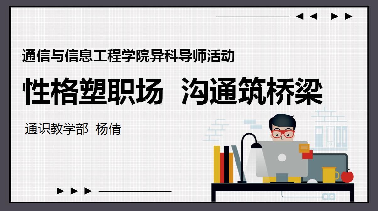 5月15日19点,由通信与信息工学院异科导师杨倩精心策划并组织的“性格塑职场 沟通筑桥梁”活动在别都书院四维空间顺利开展。本次活动旨在通过MBTI职业性格测试,帮助学生更清晰地认识自我,理解自身性格在职场中的优势和潜在挑战,并通过讲解三明治沟通法和积极主动式沟通,传授有效的职场沟通技巧,以增强学生的职业竞争力和团队协作能力。