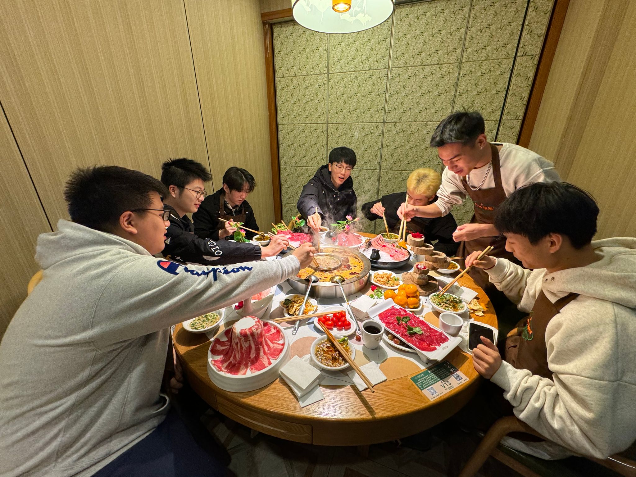 分享结束后,为更好了解学生,拉进和学生的距离,宋老师请第一组的7位同学在渝厨火锅进行了师生共膳活动。寒夜漫漫,热气腾腾的火锅一下子打开了大家的心扉。欢声笑语中,宋老师对所带班级的基本情况、学生的兴趣爱好、学生的急难愁盼问题等等都有了深入的了解,为后续更好开展工作,铺就了道路。
