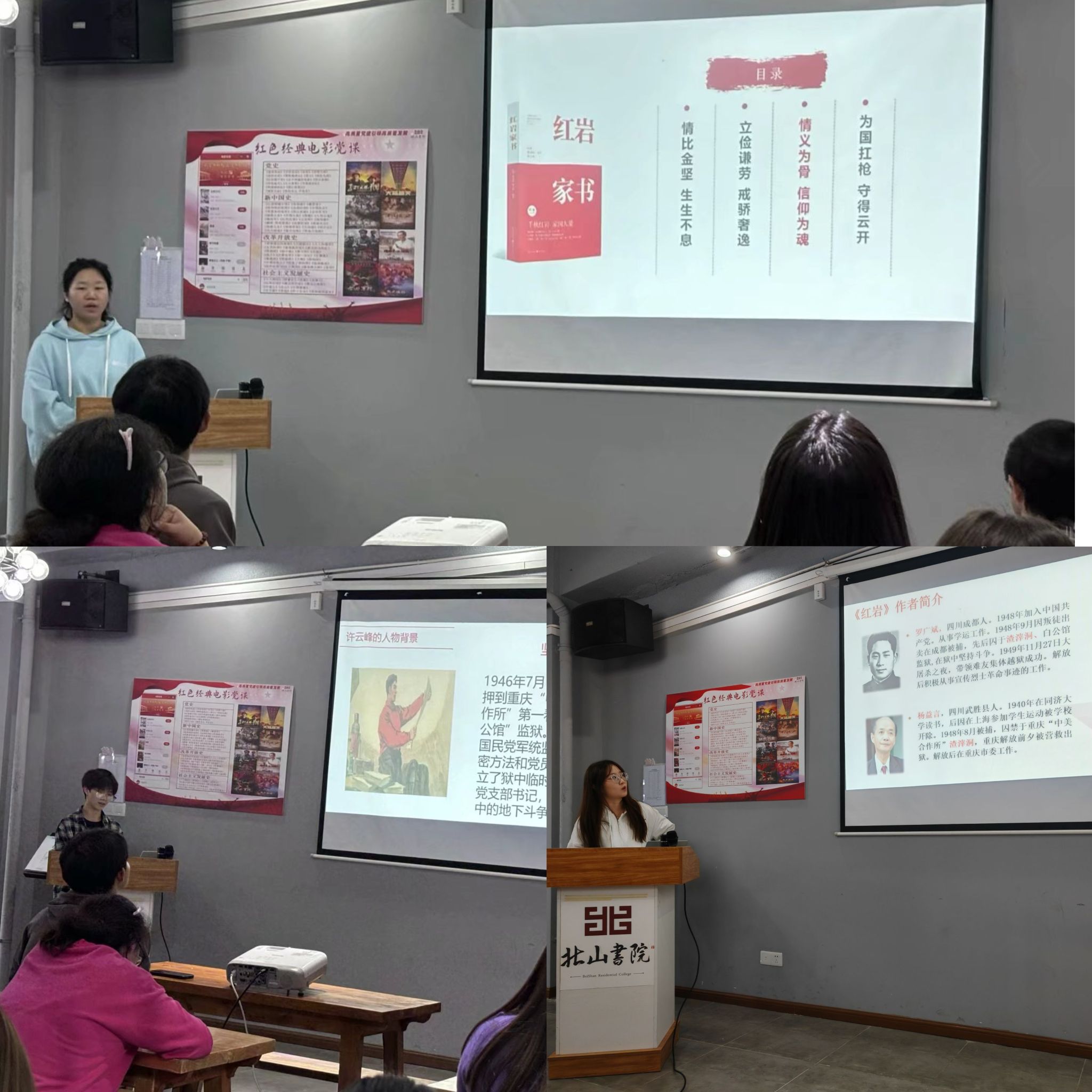 在读红岩故事环节,靳银霞老师讲述了《红岩》一书的创作背景,并从《红岩》封面设计角度解读了英雄们舍生取义的精神,她讲道:红色是血的颜色,革命的颜色,黄色是夕阳的光芒,黑色是岩石的色彩,坚硬不动摇。画中夕阳下空旷的悬崖上矗立着一颗挺拔的松树,体现了革命烈士在绝路上的壮烈斗争以及坚韧无畏的精神。接着,来自异科导师班的三位同学以生动的描述将可歌可泣的革命历史娓娓道来,讲述了江姐、钟齐、许云峰三位革命烈士顽强斗争、不惧牺牲的英勇事迹,并分享了自己的读书心得。三位同学的生动讲述,让那段曲折的历史清晰地浮现在每一个人的眼前,为同学们带来持久的感动和深沉的力量。