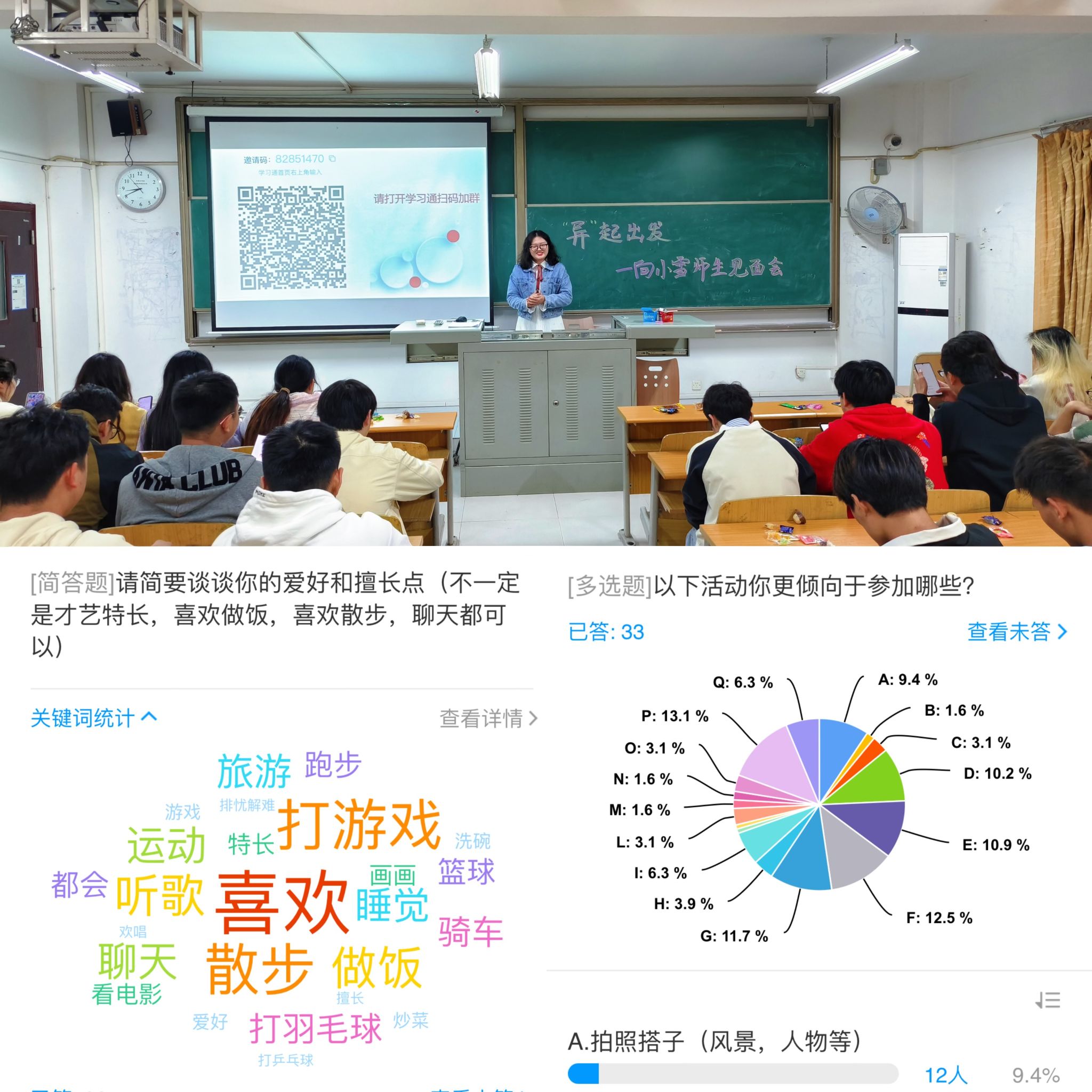 同时,为快速增进对学生的了解并掌握学生的成长需求,考虑到同学们性格各异,或外放或内敛,向老师借助学习通针对学生的学习、生活、交友、情感、喜爱的活动类型等方面进行了问卷调查,同学们纷纷打开手机积极回应。