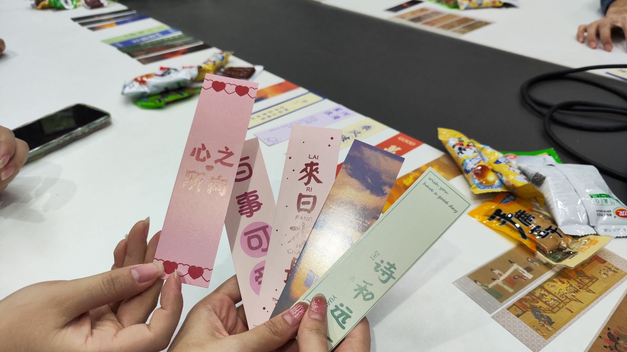 在下一环节,为增进师生之间、同学之间的相互了解,张娴雅老师组织了简单的破冰活动——请每位同学说三个关于自己的实事,其中两个为真一个为假,然后请左右两遍的同学猜哪个是假的,猜对的同学获得小礼品。喜欢做菜、足球死忠粉、爱好跳伞、社恐、沉迷车技等有意思的内容频频出现,还有位同学说自己“上课认真”是假的,其他同学却纷纷表示震惊,觉得她上课可谓是“全神贯注”,引得大家哈哈大笑。同学们吃着零食,挑选着自己喜爱的书签,在轻松愉悦的气氛中,增进了彼此之间的了解。