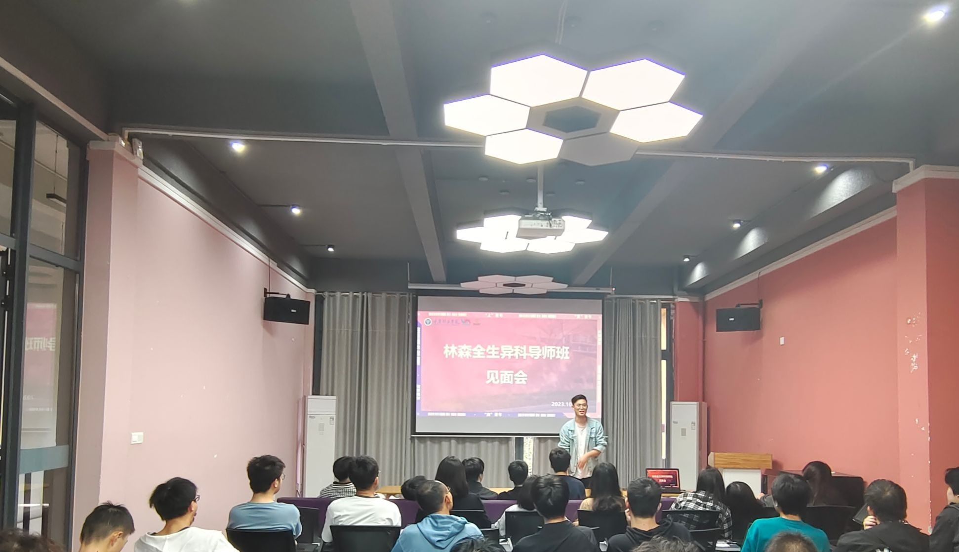 会议伊始,林森老师从学科背景、专业优势、个人特长等方面分享了自己本科阶段生活经历及实战经验。其次林老师为同学们初步讲解了全生异科导师制的相关内容,并为同学们强调了跨学科的专业教育背景对自身的影响,让同学们尽快熟悉了这个大家庭,为建立和谐平等师生关系打下了坚实的基础。