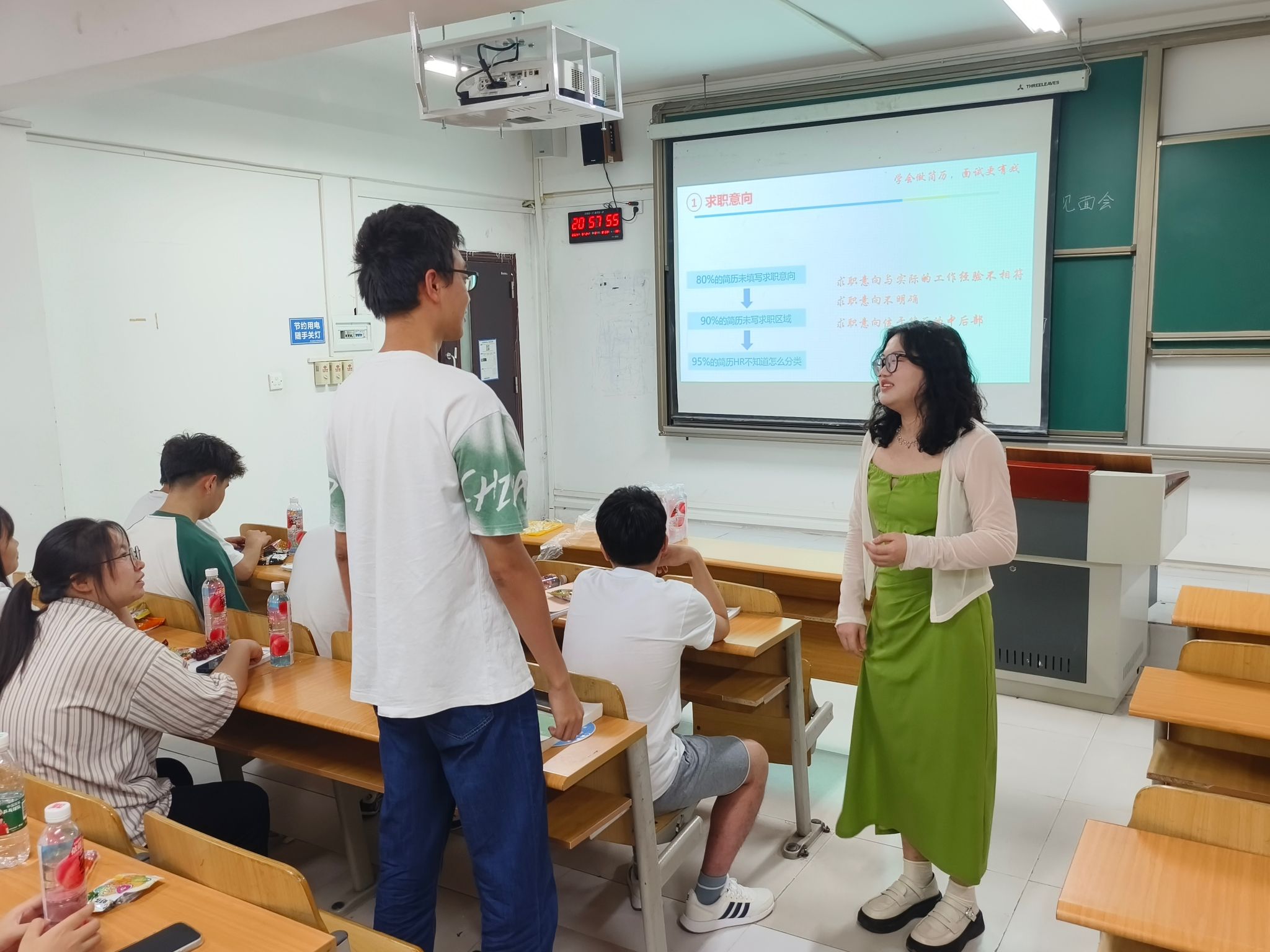 活动伊始,向老师以温馨的氛围开场,桌上摆满了精心准备的饮料、水果及零食,同学们在轻松愉快的氛围中分享着各自丰富多彩的暑假见闻,欢声笑语不断。随后,向老师巧妙引导话题转向未来,鼓励大家畅谈对未来的憧憬与规划。她特别指出,作为大四学生,实习与就业已成为当前最重要的任务之一,强调提升面试技巧、完善简历制作的重要性。