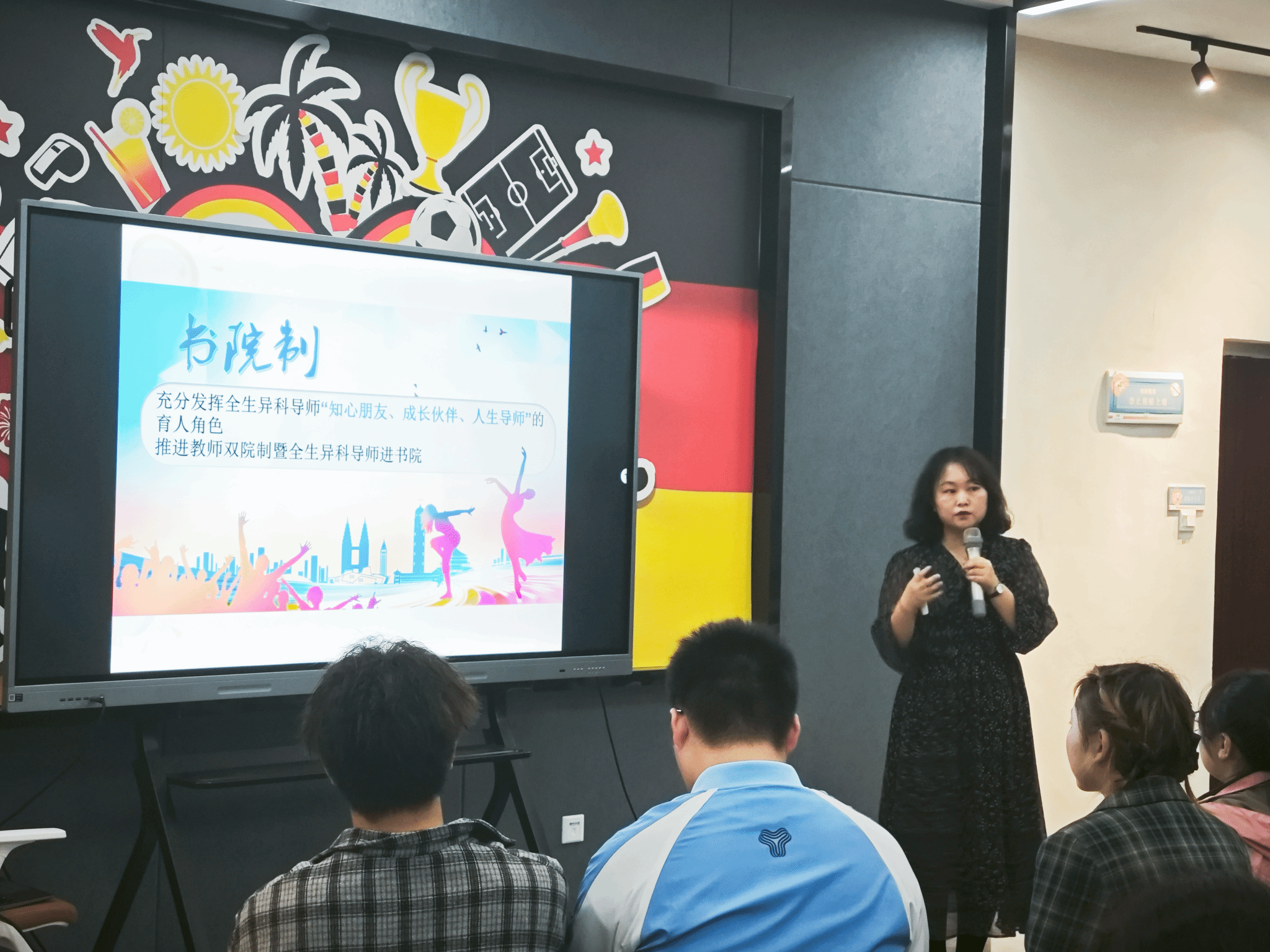 见面会从解答同学们充满好奇与不解的问题:“全生异科导师是干嘛的”开启。杨铭老师从全生异科导师的意义以及实施方式等方面进行了全面而深入的讲解:即通过跨学科的导师团队,为同学们提供更加全面、多元、个性化的指导与帮助,成为大家的“知心朋友---与你们建立深厚的友谊,成为你们倾诉心声、分享快乐与困惑的对象;成长伙伴--陪伴你们一起成长,见证你们进步和变化,为你们提供必要的指导和支持、人生导师---在你们的人生道路上给予指引和启发,帮助你们明确目标、规划未来”。