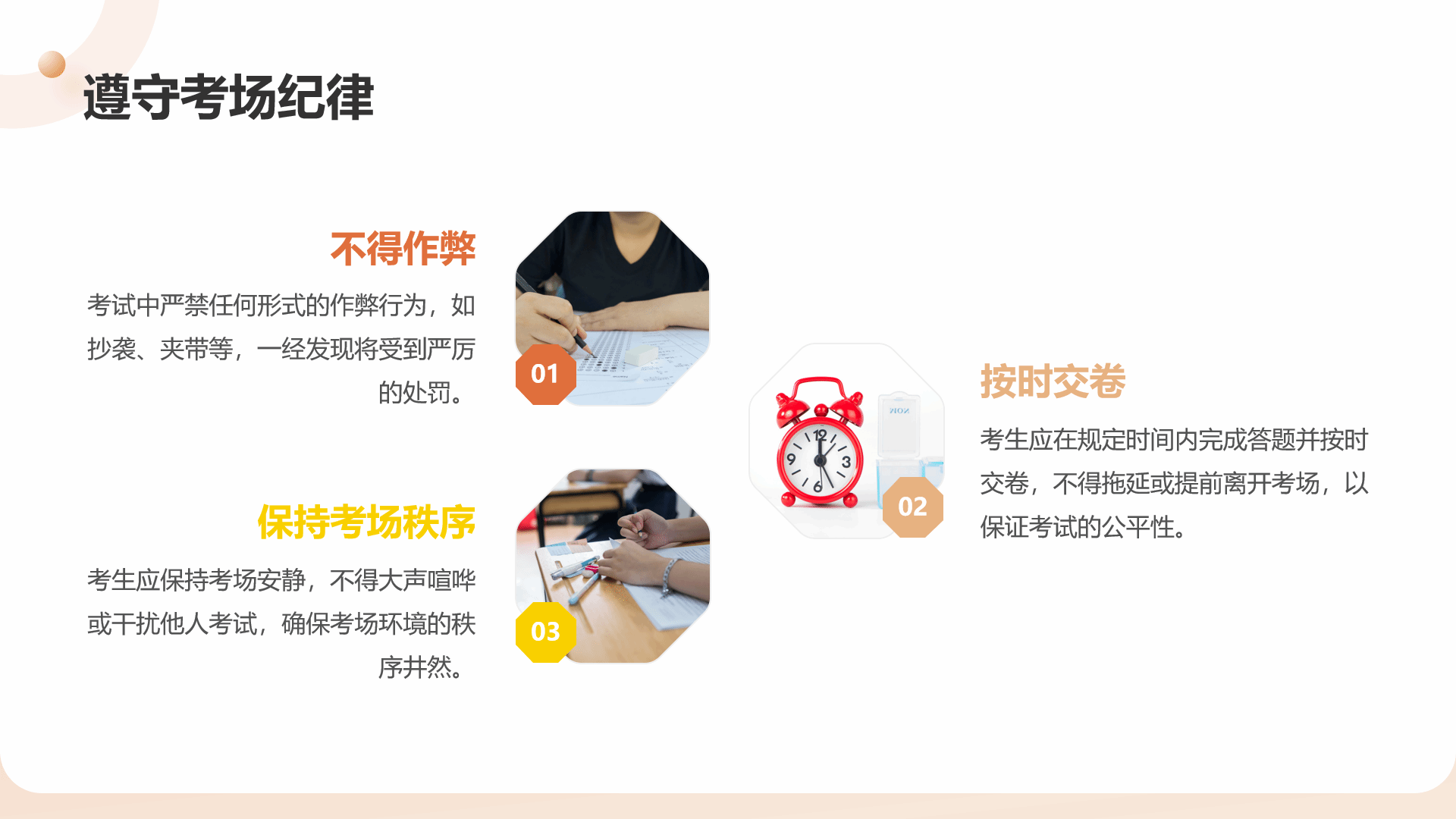 紧接着,王玲老师详细讲解了诚信考试的具体要求。从入场与座位安排到物品管理与电子设备的使用,再到试卷检查与答题规范,王玲老师逐一进行了说明。王玲老师强调,学生们应无条件遵守考场纪律,不得擅自调换座位,所有与考试无关的物品必须放置在指定位置,严禁带入座位或藏匿。同时,王玲老师还提醒学生们在答题时要使用规定的答题工具,并按照指定区域作答,确保试卷整洁、字迹清晰。此外,王玲老师还详细阐述了考场纪律与沟通方式,以及考试结束与离场流程,确保学生们对考试流程有清晰的认识。
