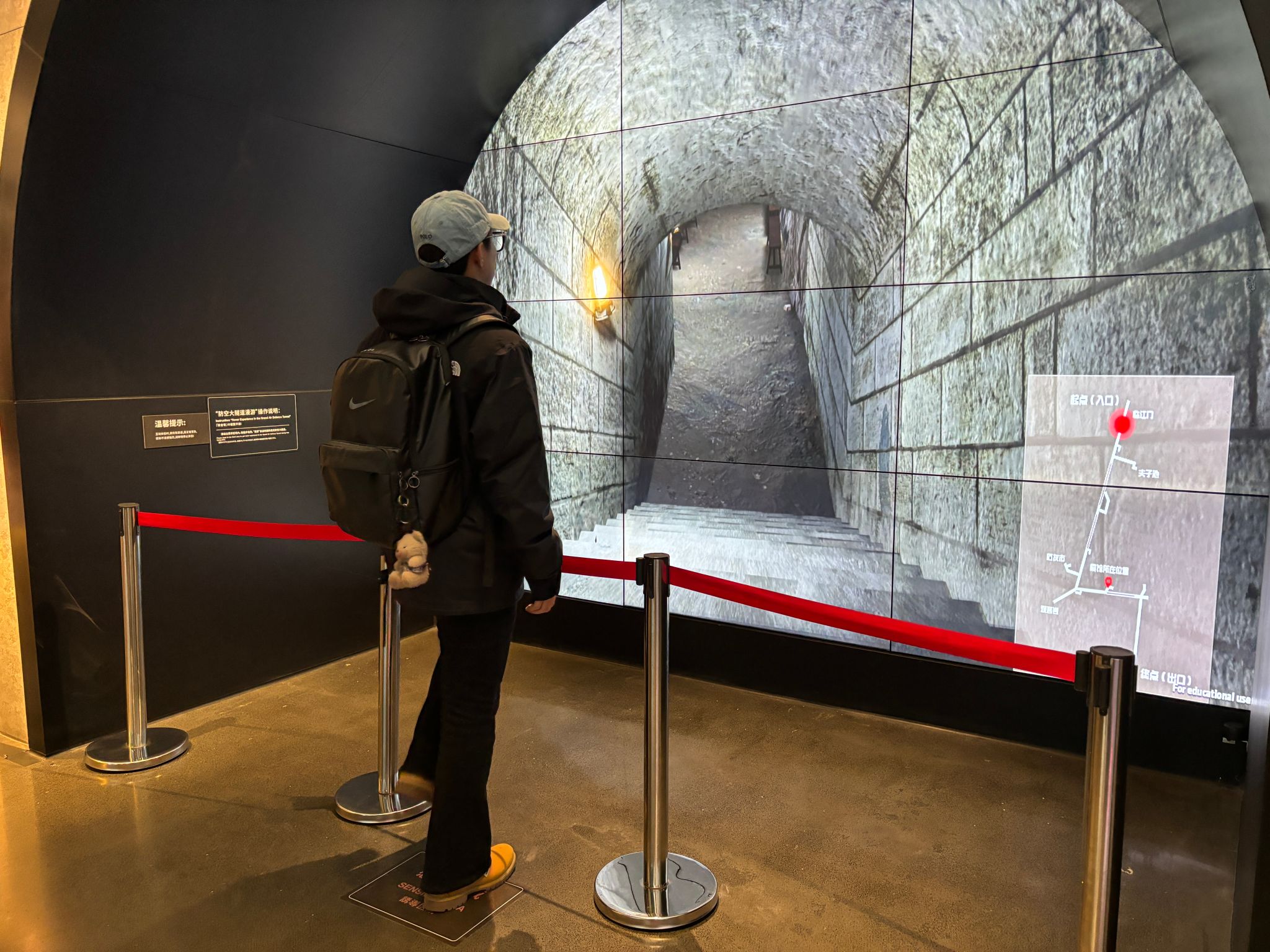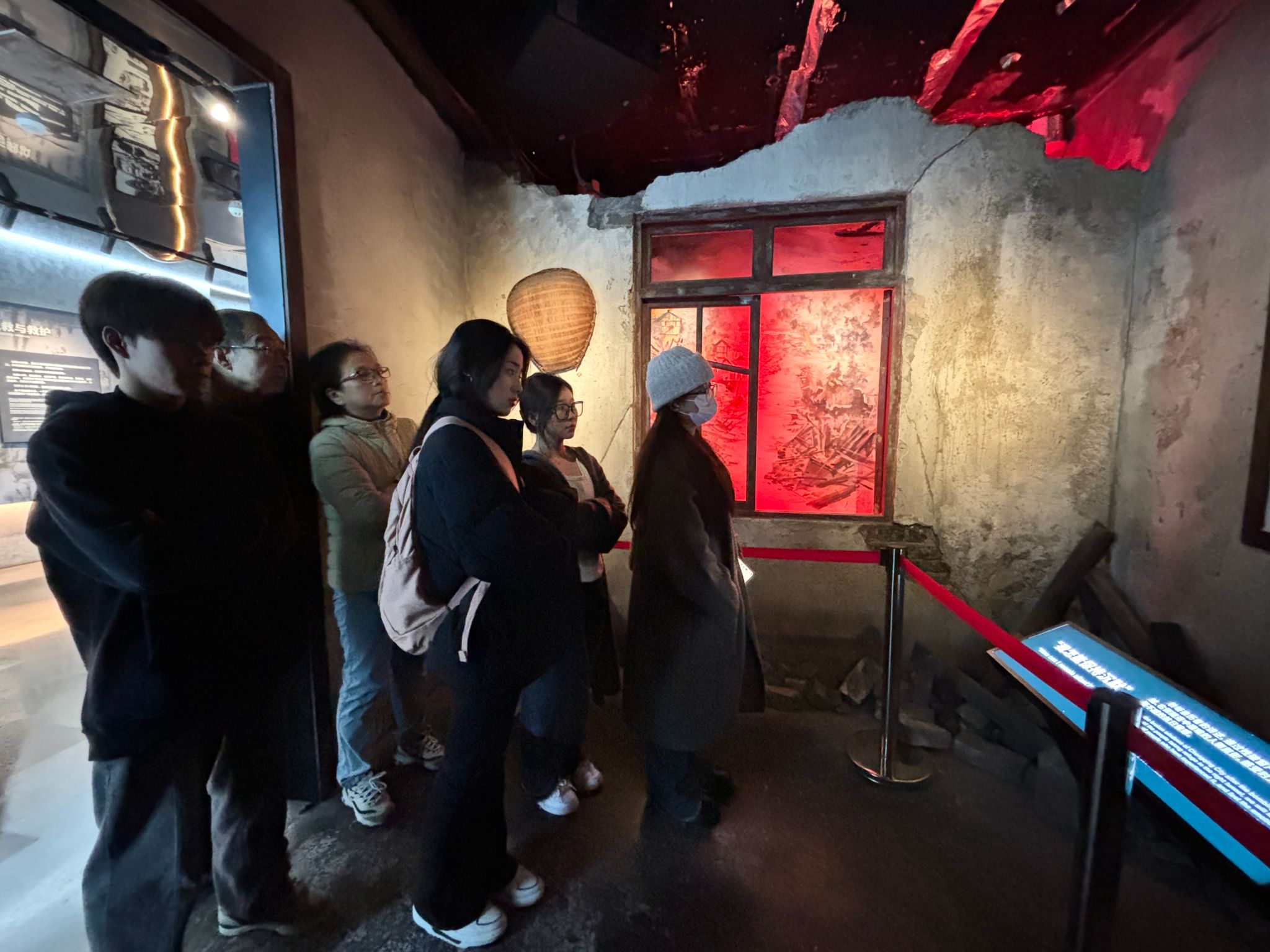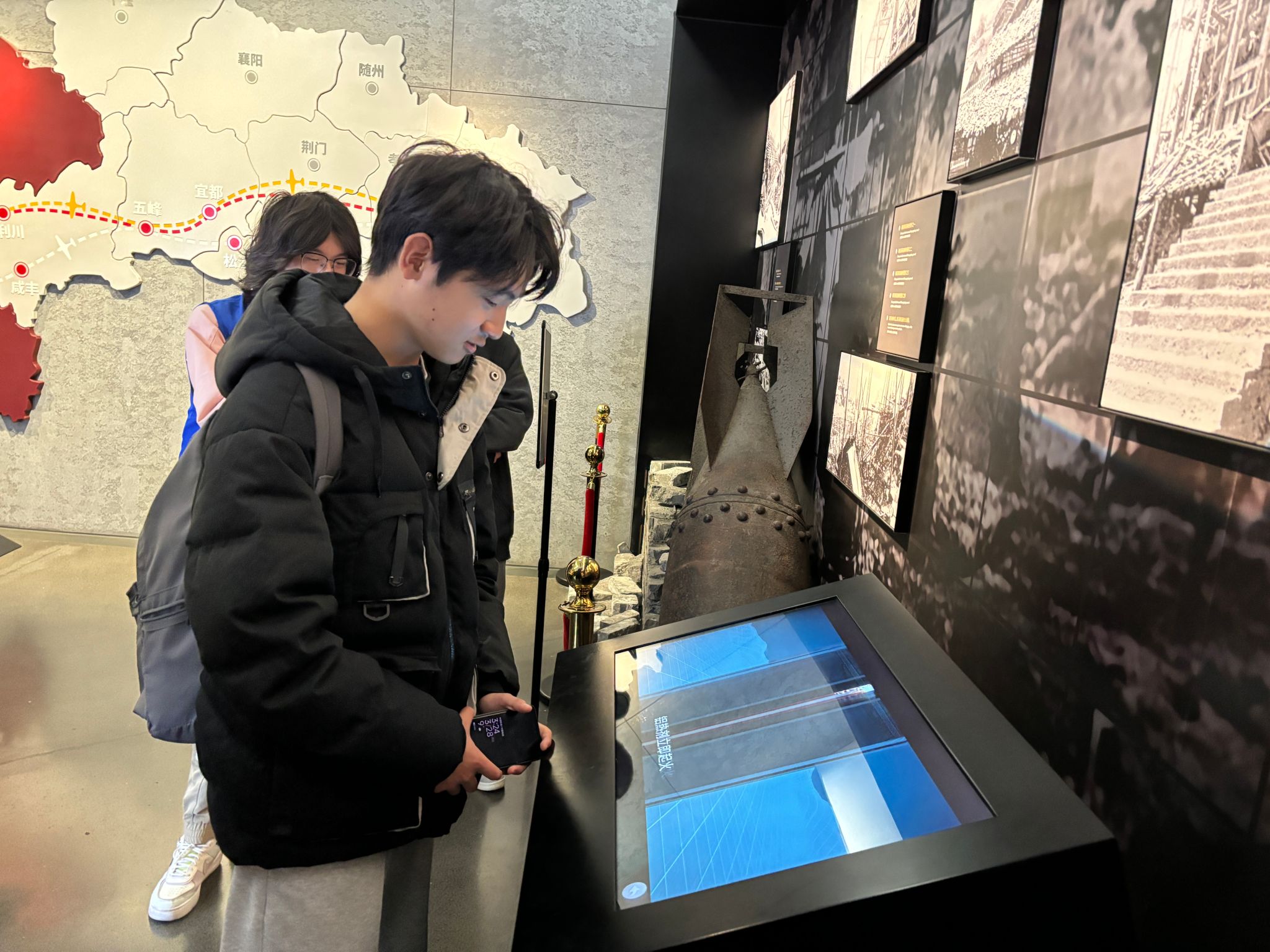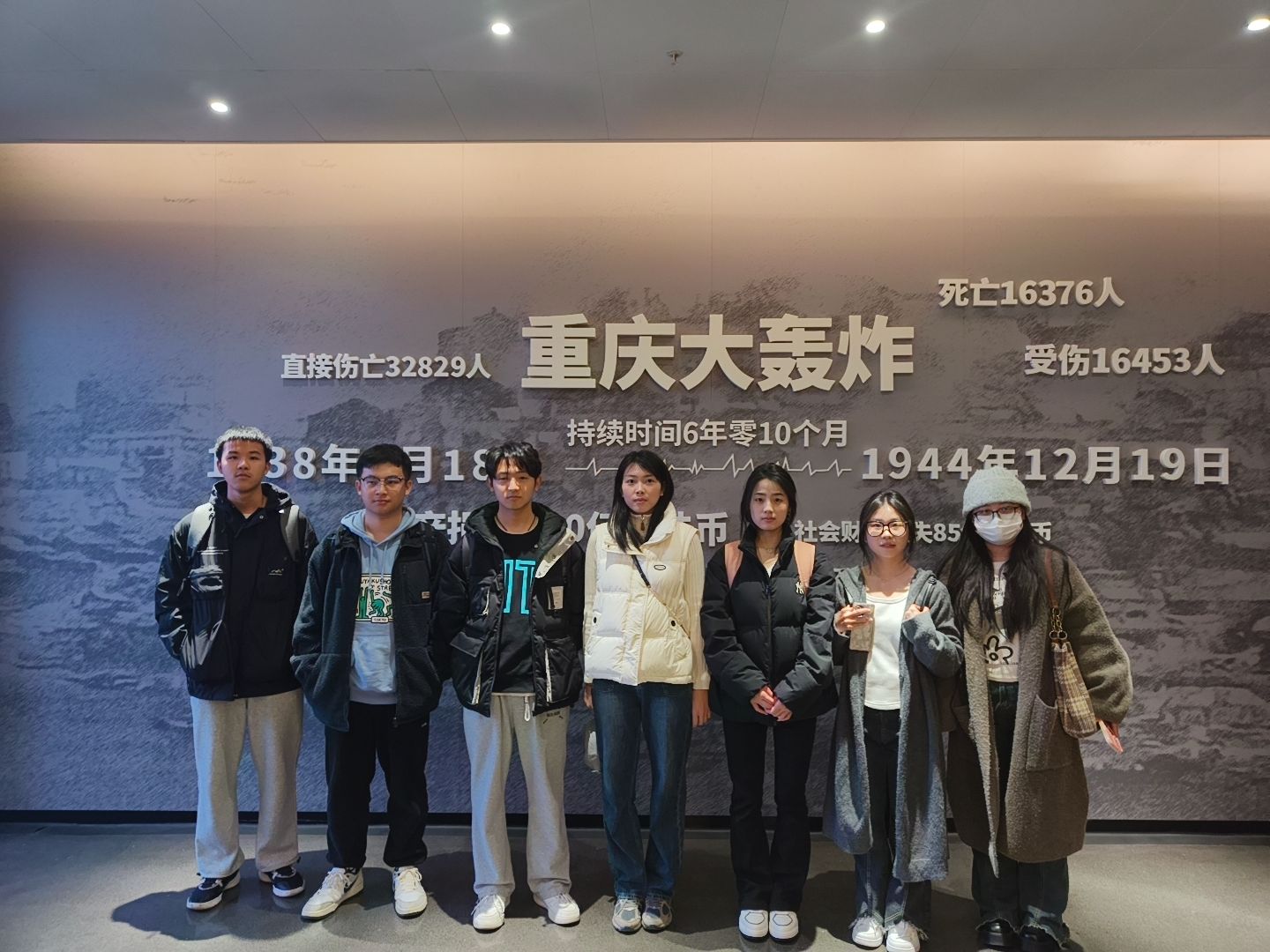 “六·五”隧道惨案是重庆作为战时首都承受苦难的缩影,更是中华民族不屈精神的象征。展区内,“为民族生存而抗战到底”字样的牛角火药筒、“抗战到底”青花瓷罐、各种样式的防空洞入洞证、遇难者名单、遗物和大量影像资料,无声诉说着那段惨痛历史。课本上的文字变成了眼前的实景,才真正理解‘惨案’二字的重量。潘燕老师带领同学们分别重点参观了遗址陈列《国民公报》原始报道、幸存者口述档案等,在模拟防空洞中,同学们似乎在躬身进入狭窄的隧道遗址,切身感受当年民众的恐惧与坚韧,有同学表示感慨,“当代青年虽无需直面炮火,但科技竞争、文化博弈等‘没有硝烟的战争’同样需要吾辈奋勇担当。”