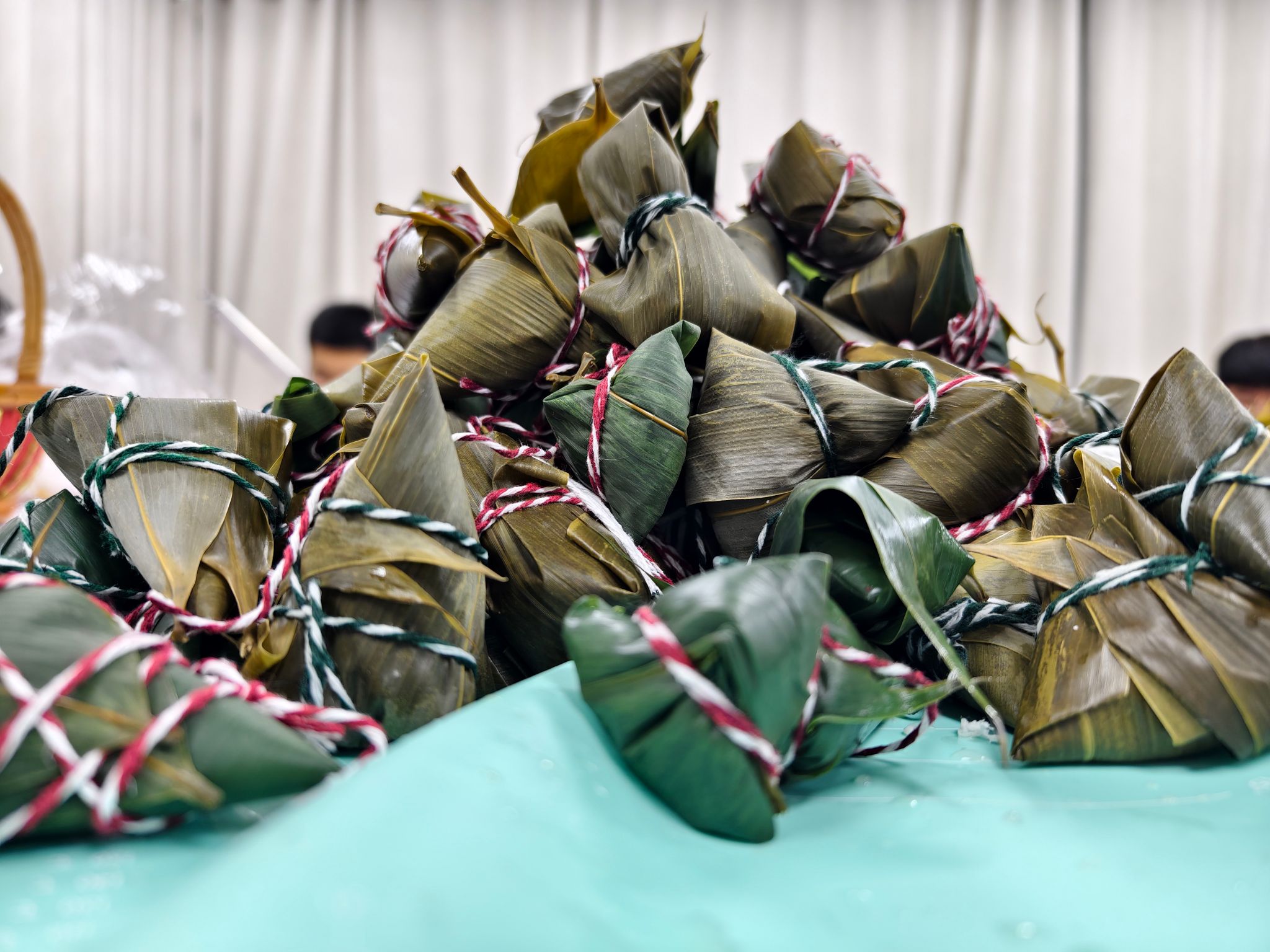 掌握了基本技巧后,师生们分工合作,开始了包粽子大比拼。老师和同学们认真地挑选粽叶,仔细地包裹糯米和馅料力求将粽子捆得严严实实。同时,发挥创意,包出三角形、四角形甚至迷你粽。活动现场欢声笑语不断,其乐融融,不一会儿,一个个形态各异的粽子便堆满了桌子。在这个过程中,师生们相互交流、相互学习,不仅提高了包粽子的技巧,还激发了彼此的创造力和想象力,让传统技艺焕发出新的活力。