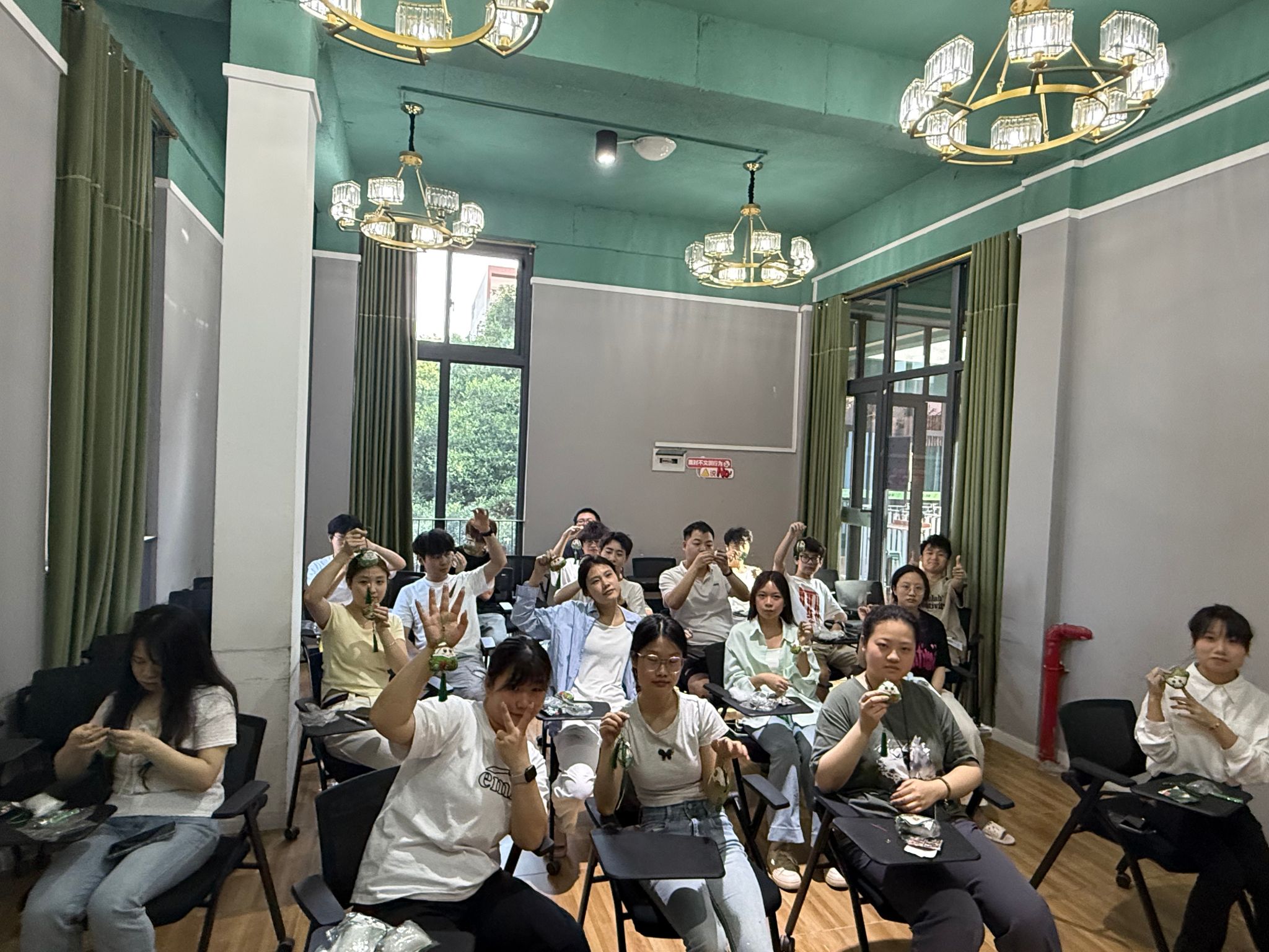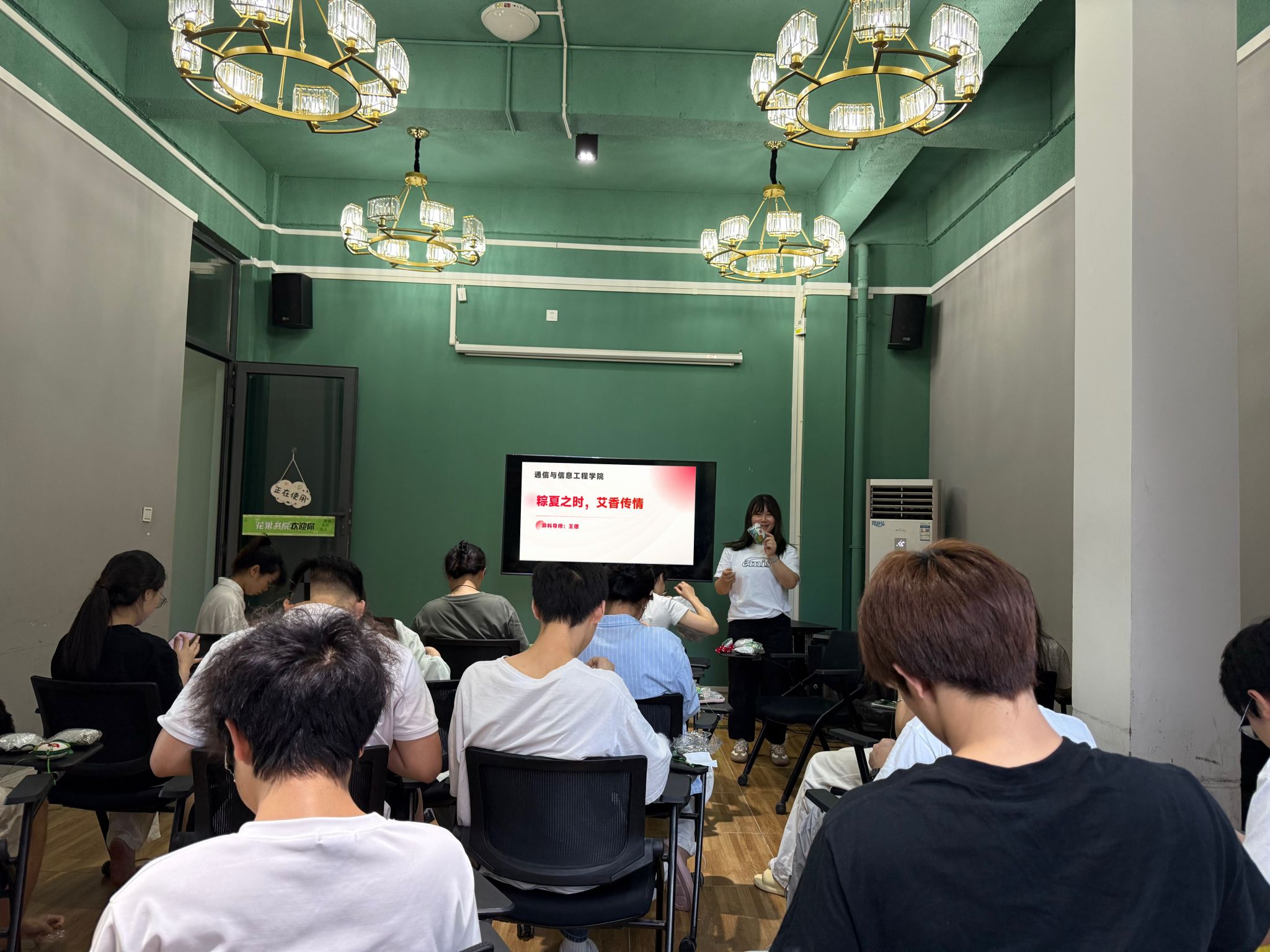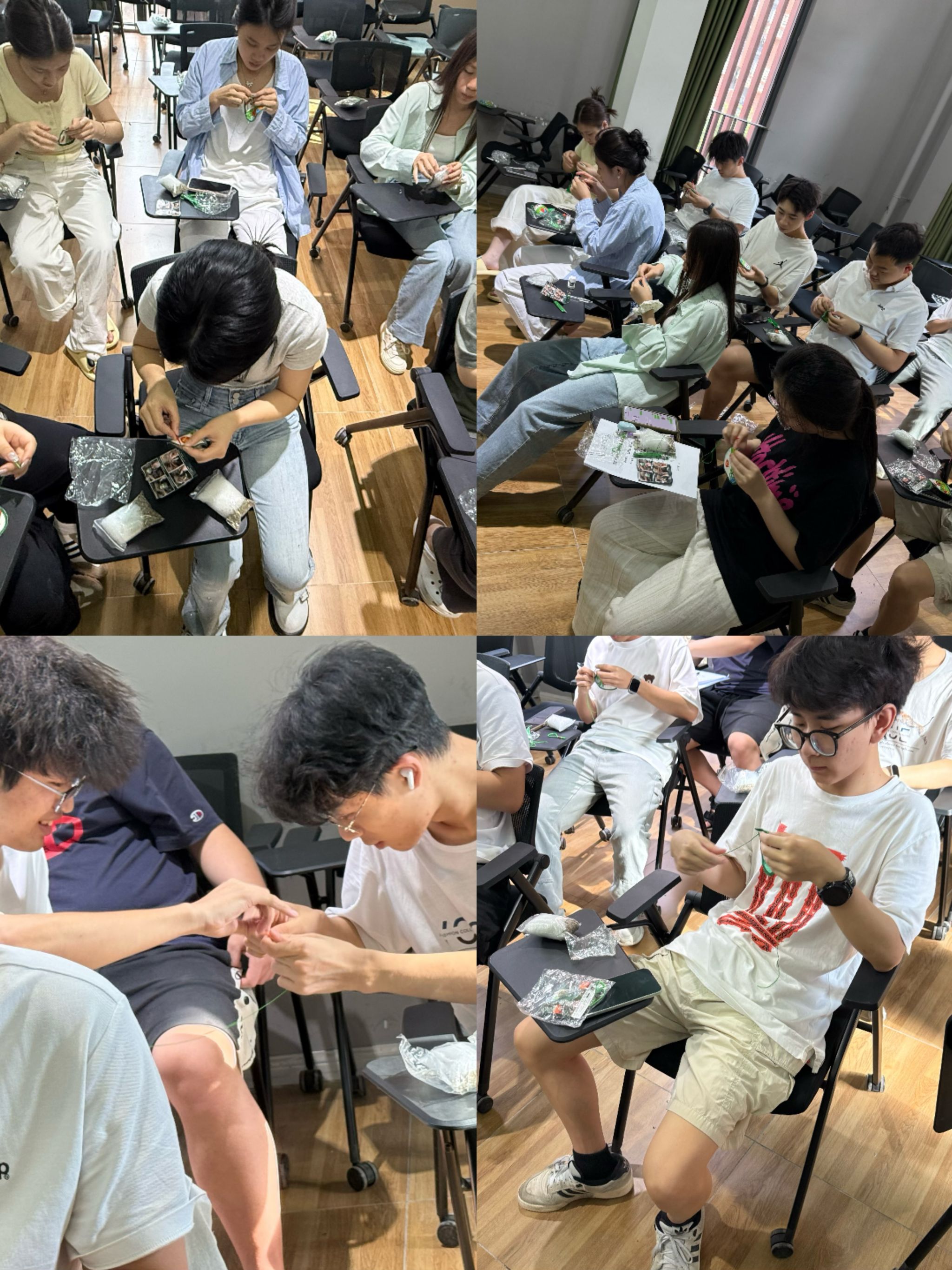 随后,在导师的指导下,学生们纷纷拿起材料,开始动手制作。从穿针引线到填充艾草,再到最后的封口装饰,每一个步骤都凝聚着大家的专注与用心。导师们穿梭在学生中间,耐心地解答问题,手把手地指导技巧,现场充满了欢声笑语。