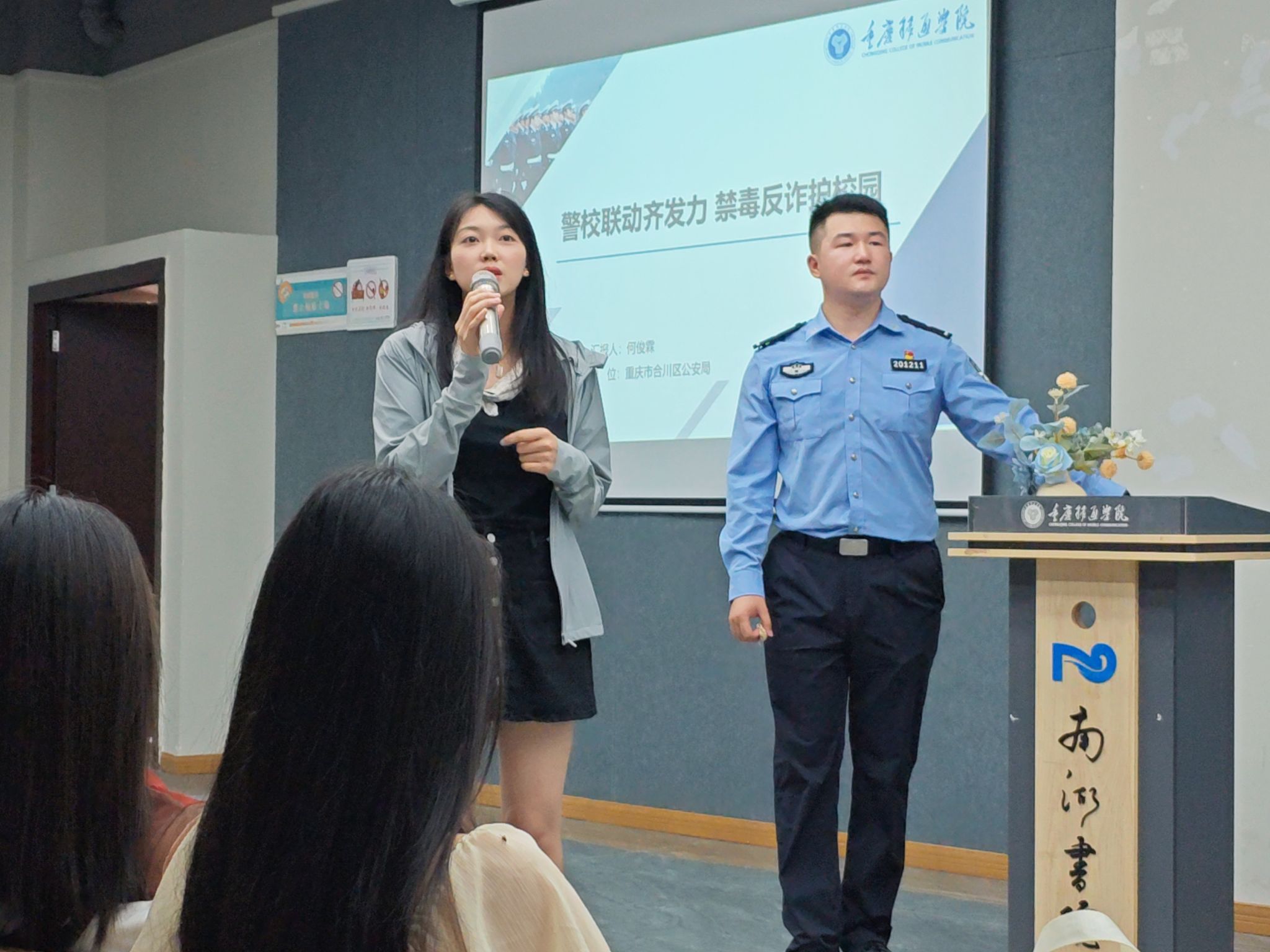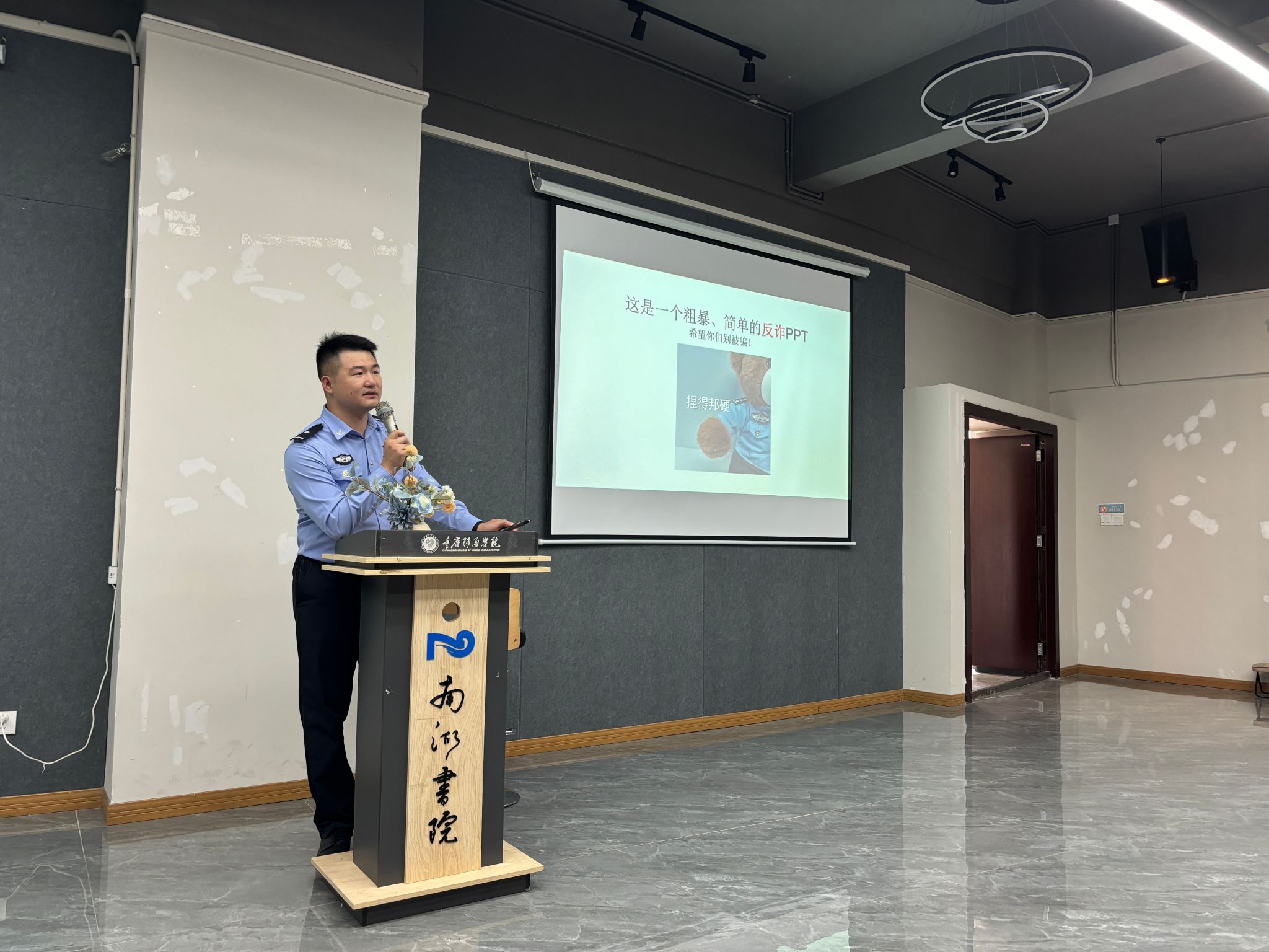 为进一步增强高校学生群体的反诈与禁毒意识,筑牢校园安全防线,6月15日上午10时,一场别开生面的反诈禁毒宣传活动在重庆移通学院校南湖书院声影活动室热烈展开。异科导师潘燕邀请了重庆市合川区的公安民警何俊霖,为2024级通信与信息工程专业的学生带来了一场生动且实用的知识讲座。