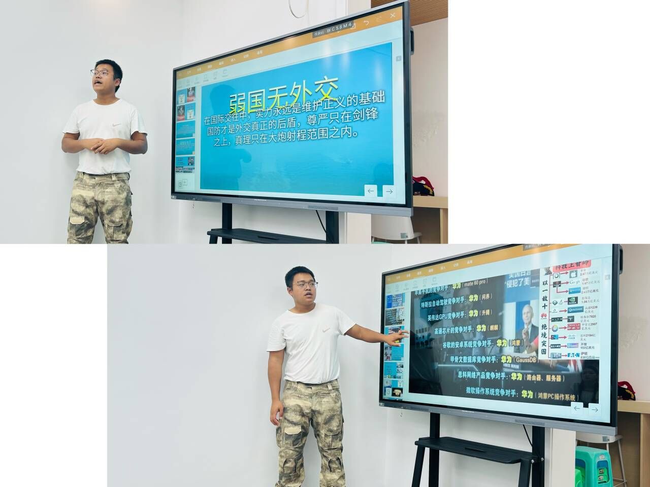 活动的压轴是由学校征兵工作站专项教师江旭东带来精彩讲座。江老师以“当前国际形势与我国安全环境”为主题,结合鲜活案例,深刻剖析了“弱国无外交”的现实逻辑,着重强调了新时代青年所肩负的国防重任。讲座内容发人深省、语言生动有力,深深触动了在场学生的心灵。特别是两位已报名参军的学生,他们表示此次培训进一步坚定了他们投身军营、保家卫国的崇高信念。