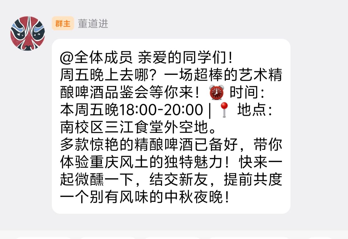 为打破学科壁垒、深化师生联结,同时提前营造中秋氛围,2025年9月28日晚18:00-20:00,异科导师董道进在南校区三江食堂外空地,组织“酿味品香话中秋”精酿啤酒品鉴会,不同专业同学齐聚,在味觉体验中感受文化,于轻松交流中收获成长。
