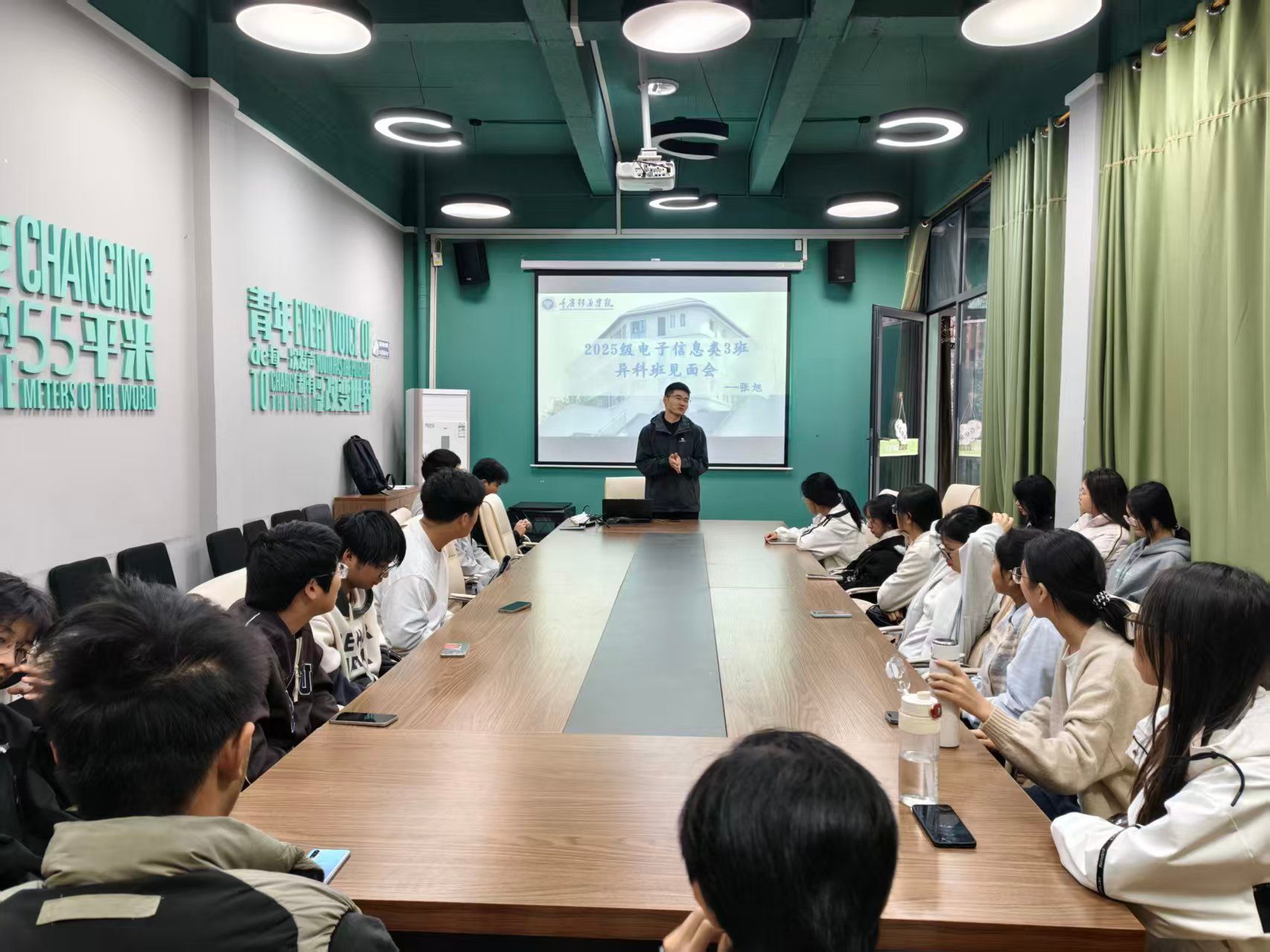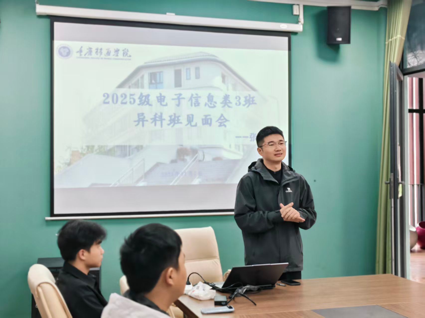 为丰富学生的校园文化生活,深入贯彻学校“四位一体双院制”特色育人理念,2025年11月7日上午10时,异科班导师张旭与2025级电子信息类3班全体学生在花果书院3号楼大型会议室共同组织并开展异科班师生见面会。