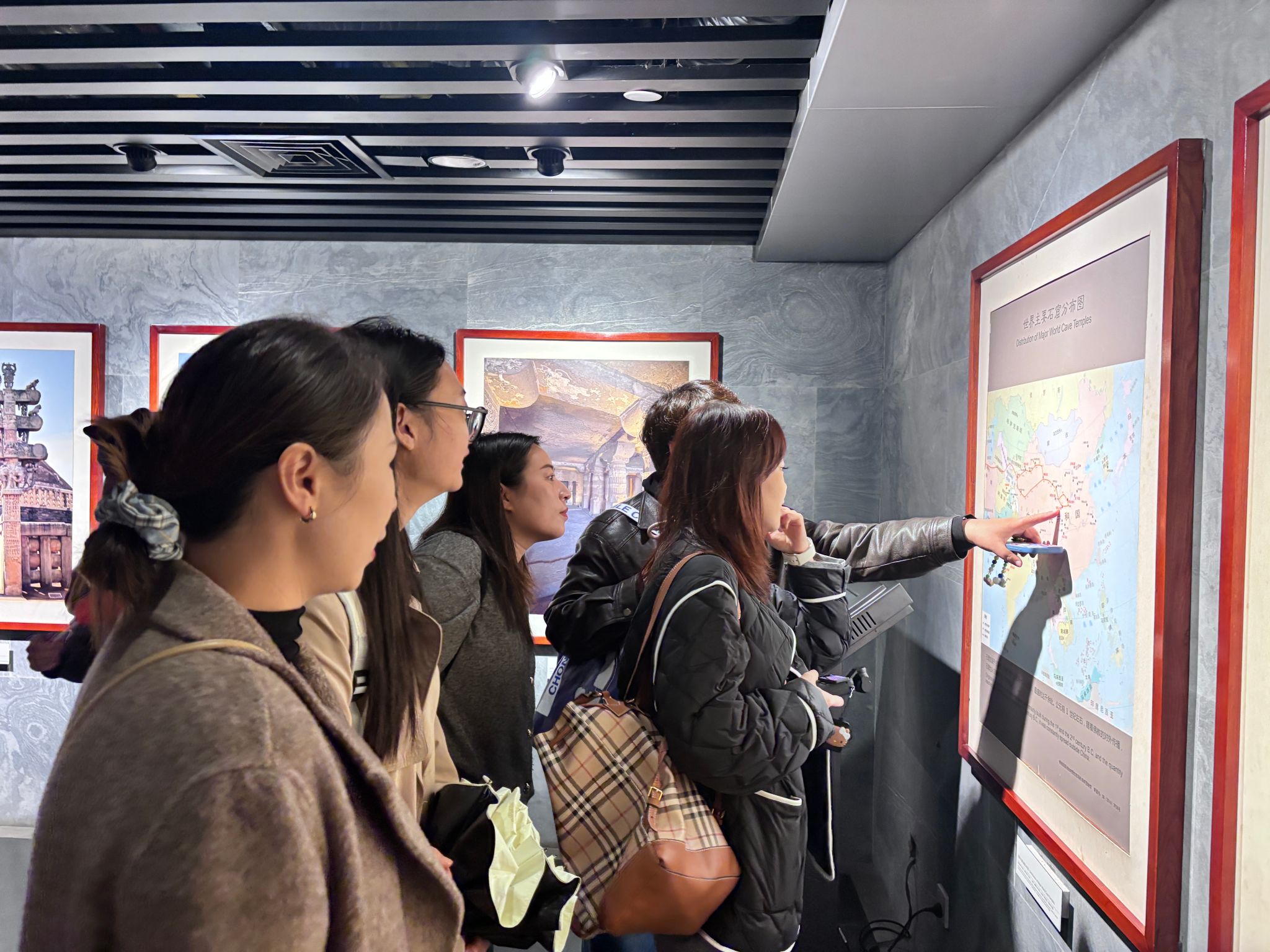 在大足石刻博物馆,师生们通过珍贵的文物陈列、动态的沙盘演示与详尽的图文解说,系统了解了大足石刻的历史脉络、雕刻技艺与文化内涵。从“世界主要石窟分布图”前的驻足探讨,到各类石刻造像复制品的近距离观察,学生们跳出专业局限,从艺术、历史、人文等多维度拓展认知边界。