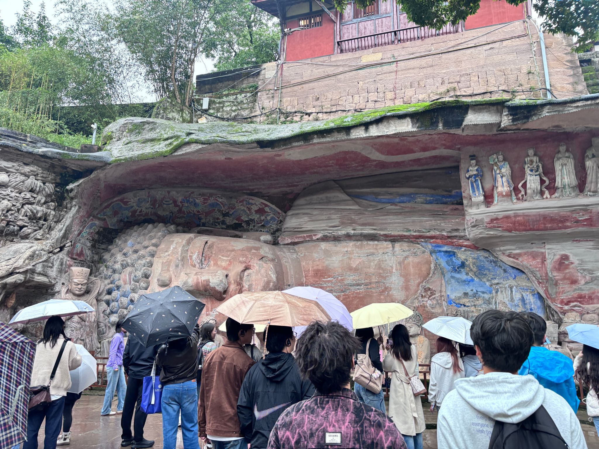 步入宝顶景区,雨中的石刻更显古朴深邃。巨型卧佛的雄浑大气、六道轮回图的精妙构思、千手观音的金碧辉煌……每一处造像都让学生们叹为观止。大家或聆听讲解,或驻足凝视,在雕刻艺术的震撼中感悟古人的智慧匠心,在文化遗产的传承中思考当代青年的责任担当。通信工程专业的学生甚至从工程角度,对石刻的结构稳定性、雕刻工艺的精准度展开了热烈讨论,实现了专业思维与文化认知的有趣碰撞。