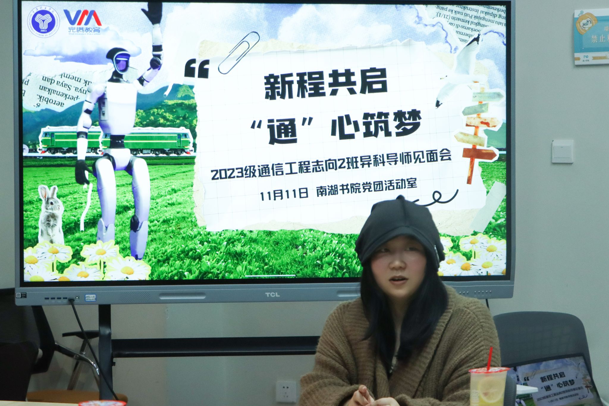 为帮助2023级通信工程专业志向2班学生进一步明晰大学成长方向,深入理解全生异科导师制度的价值,搭建师生双向沟通的温暖桥梁,11月11日,异科导师屈畅在南湖书院党团活动室开展以“新程共启 ‘通’心筑梦”为主题的新生见面会。行的成长新篇章。