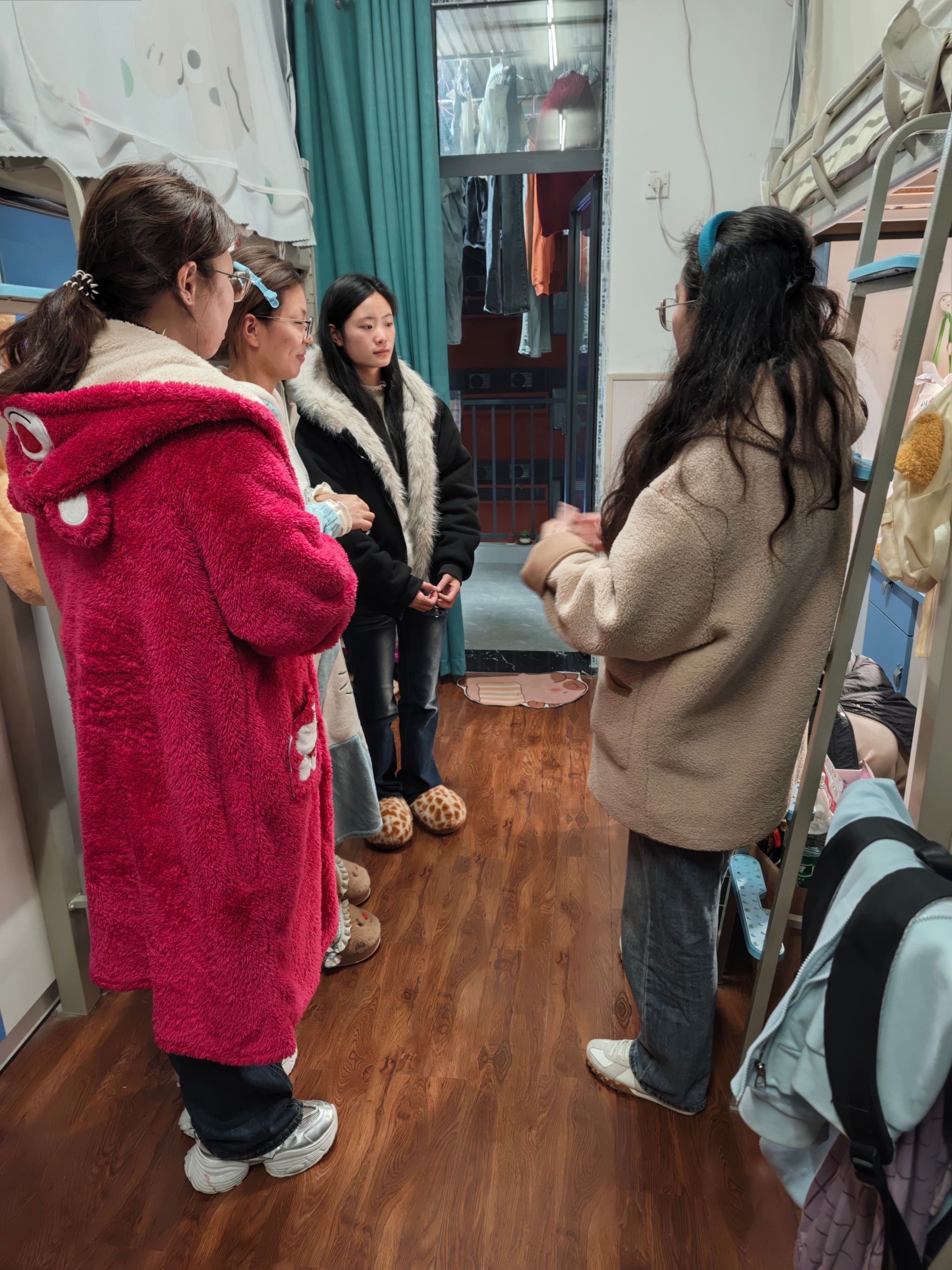 生活关切,传递温暖。生活上的关怀同样细致入微。吴红鑫老师仔细查看寝室的设施,询问同学们在冬季的保暖措施是否到位,提醒大家要注意添衣保暖,预防感冒。她还关注同学们的饮食情况,叮嘱大家要合理膳食,保持健康的饮食习惯。对于一些因离家较远而思乡的同学,也耐心倾听她们的心声,给予安慰和鼓励,让大家感受到学校这个大家庭的温暖。