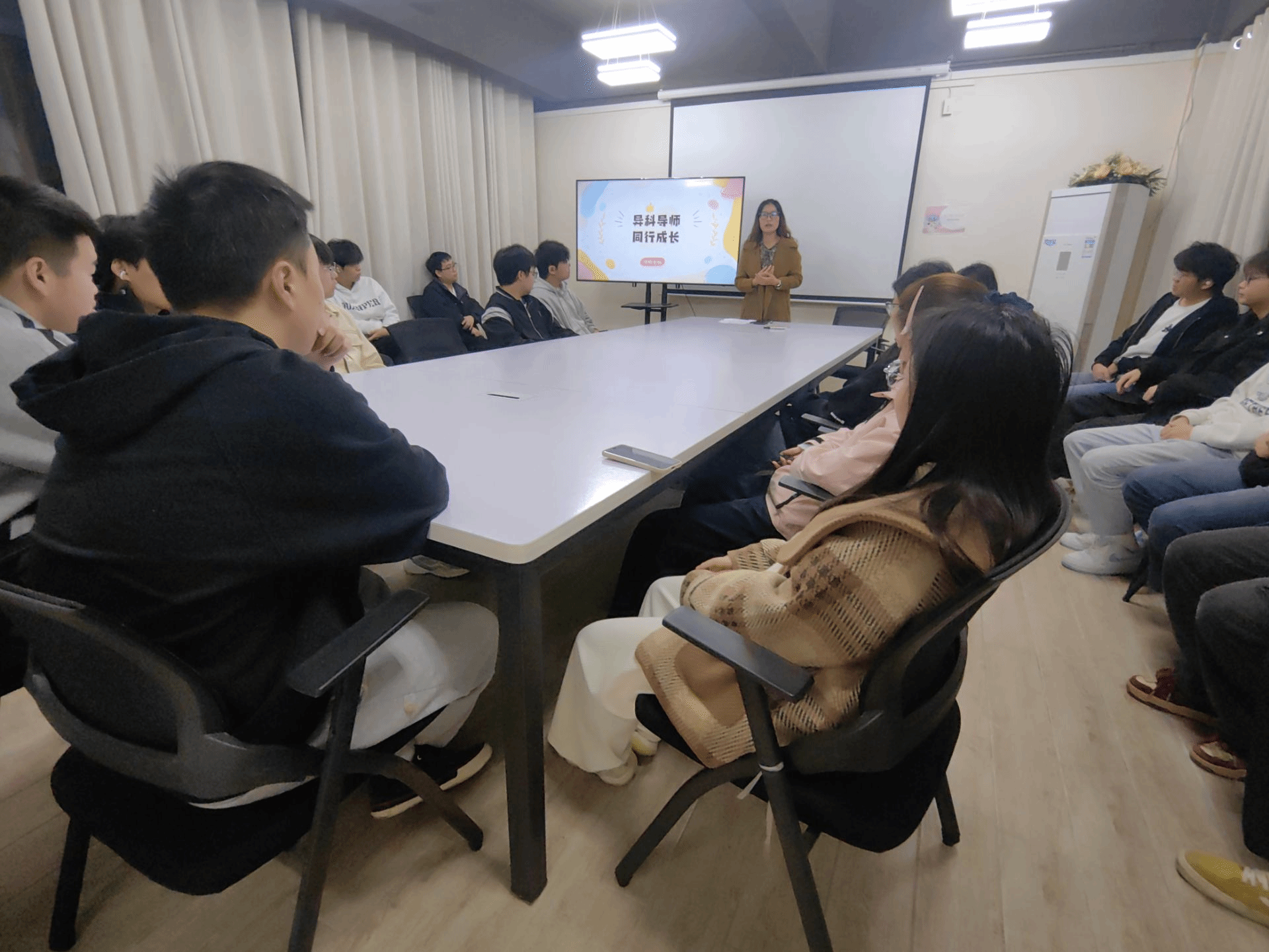 见面会上,胡婷师介绍了学校异科导师制,并明确表示将以朋友身份与学生相处,不查考勤、不催作业,聚焦解决“本专业老师没精力管”的跨界问题。同时界定服务边界:不替学生做决策、不直接给答案,而是陪伴寻找方法。此外,导师还分享了自身的工作经历,增进学生了解。