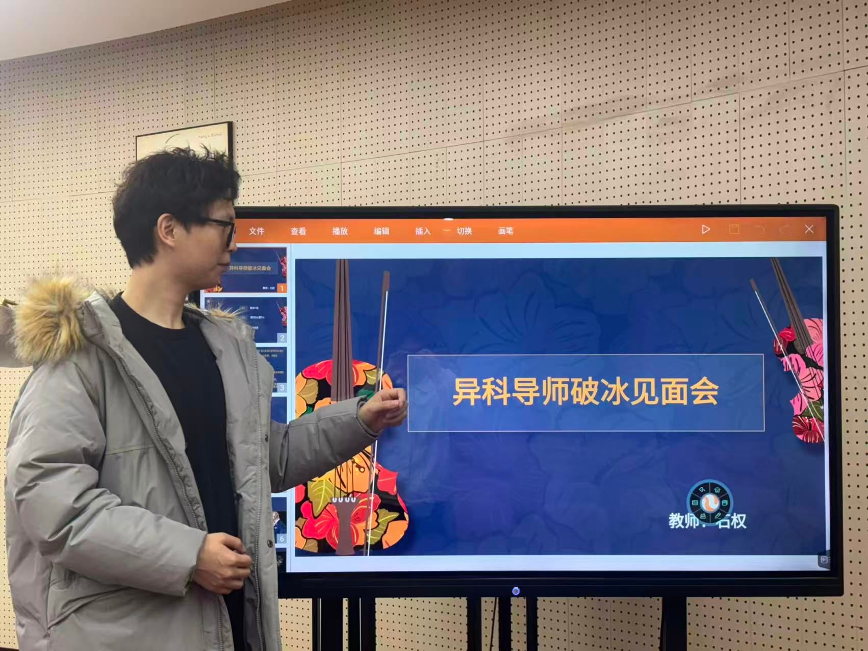 艺术展演过后,师生互动交流环节正式开启。石权老师首先进行自我介绍,他分享了自己的专业背景、多年的教学经验以及个人兴趣爱好,“除了教学,我平时最喜欢的就是拉小提琴,音乐能让人静下心来,也希望今天能通过音乐,让大家感受到我的真诚。” 他强调,异科导师的角色不同于专业课老师,更像是学生大学时光里的 “陪伴者” 与 “引路人”,“不管是学习上的难题、生活中的困惑,还是心里的小烦恼,大家都可以随时找我沟通。”