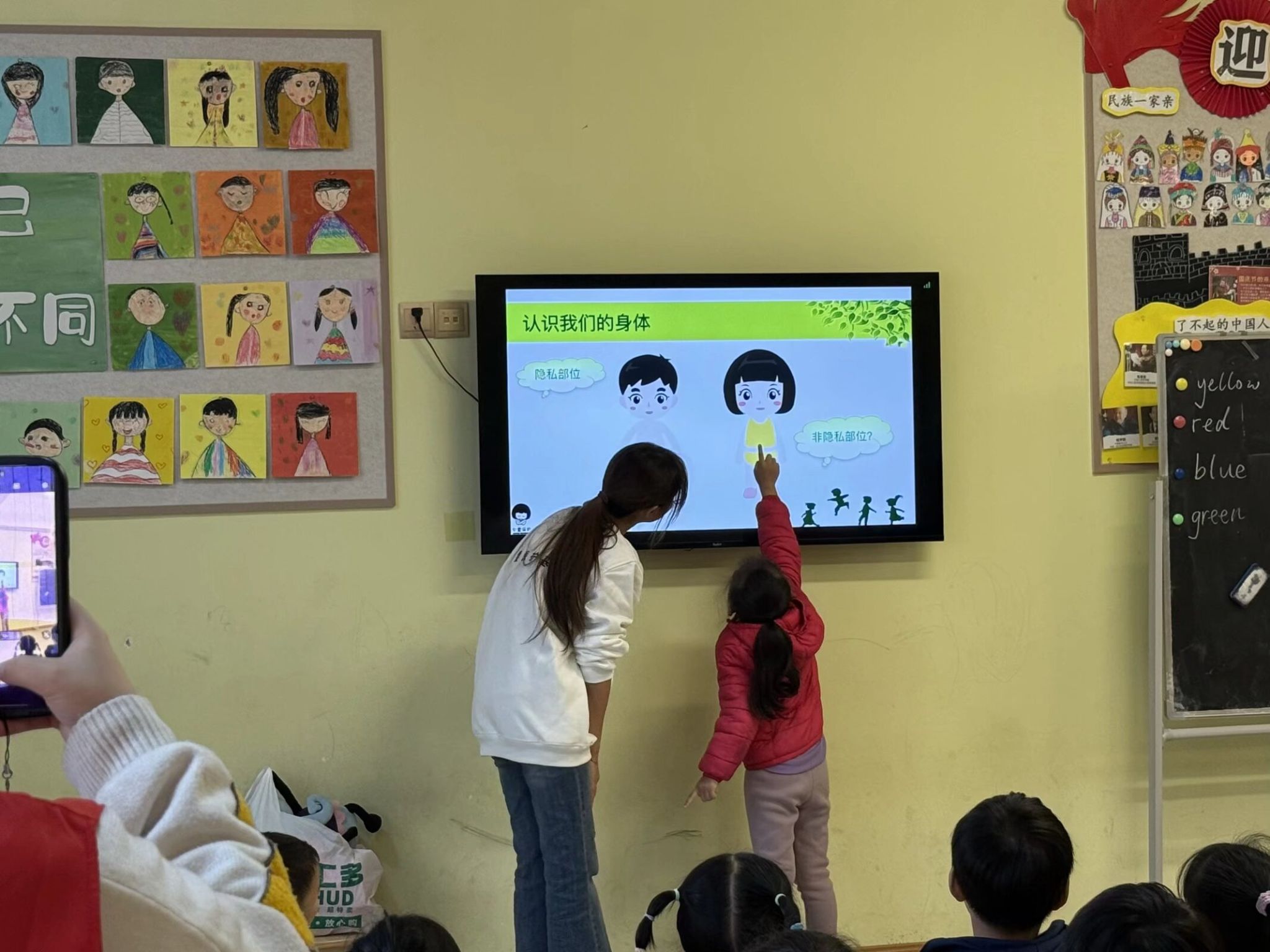 活动正式开始后,学生讲师朱沁宇以亲切的语气开启课程,迅速吸引了孩子们的注意力。在隐私部位认知环节,朱沁宇借助拟人化的身体结构图,用“小背心、小短裤遮住的地方是我们的隐私部位,不能让别人随便看、随便碰”的通俗表达,帮助孩子们建立身体边界意识;针对幼儿容易轻信他人的特点,讲师通过情景游戏“安全小考验”,模拟“陌生人给零食要求抱抱”“熟人触碰隐私部位”等场景,引导孩子们判断危险行为,并现场演示和教授自我保护的方法。