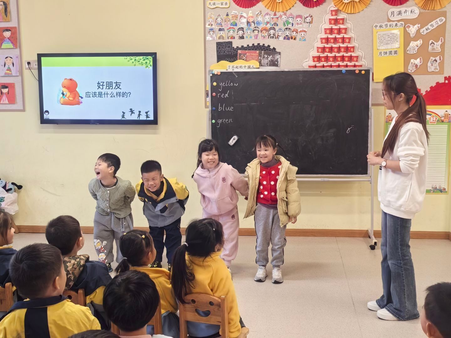 课堂上,异科导师学生作为授课助教,分工明确、配合默契:郭贵明、胡景鹏负责协助讲师开展互动游戏,发放卡通贴纸奖励积极参与的孩子;吴妮洲、刘松、卢籽江则重点关注内向幼儿的参与情况,耐心引导他们表达想法,及时解答孩子们的疑问。孩子们在游戏互动中积极举手、大胆回应,原本严肃的安全知识在趣味体验中被轻松吸收,现场气氛热烈而有序。杨倩老师全程观察课堂动态,适时给予指导,确保教学效果落到实处。