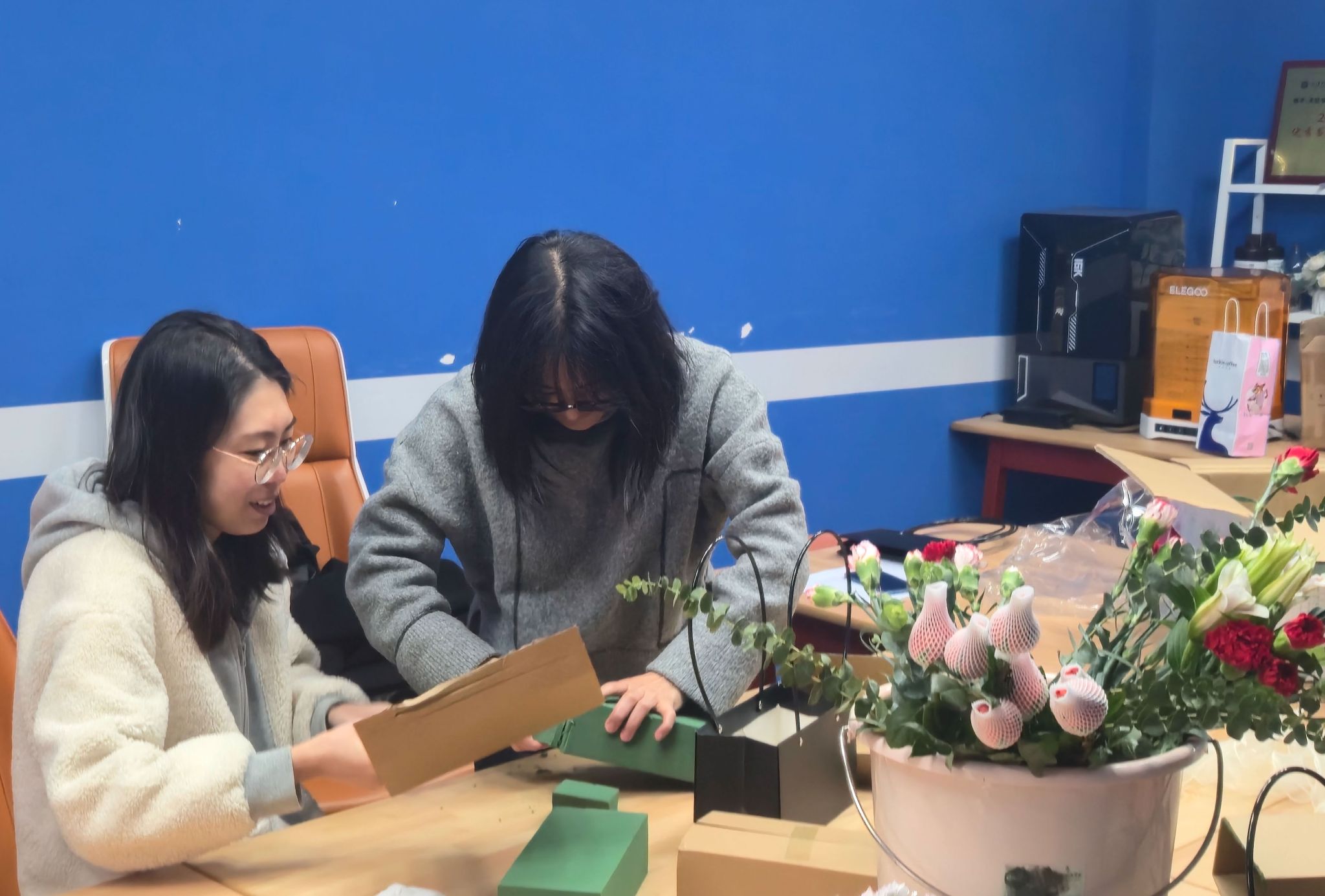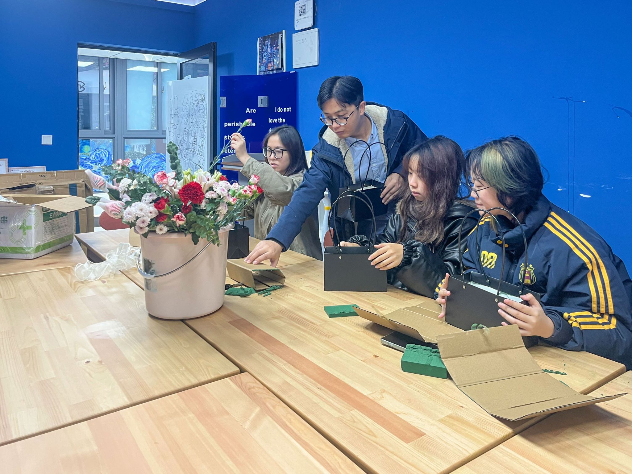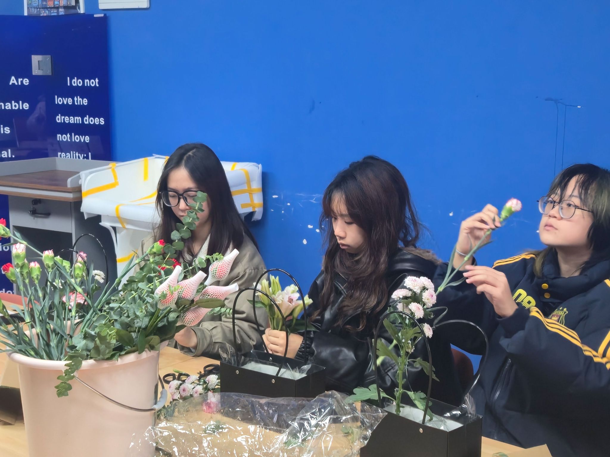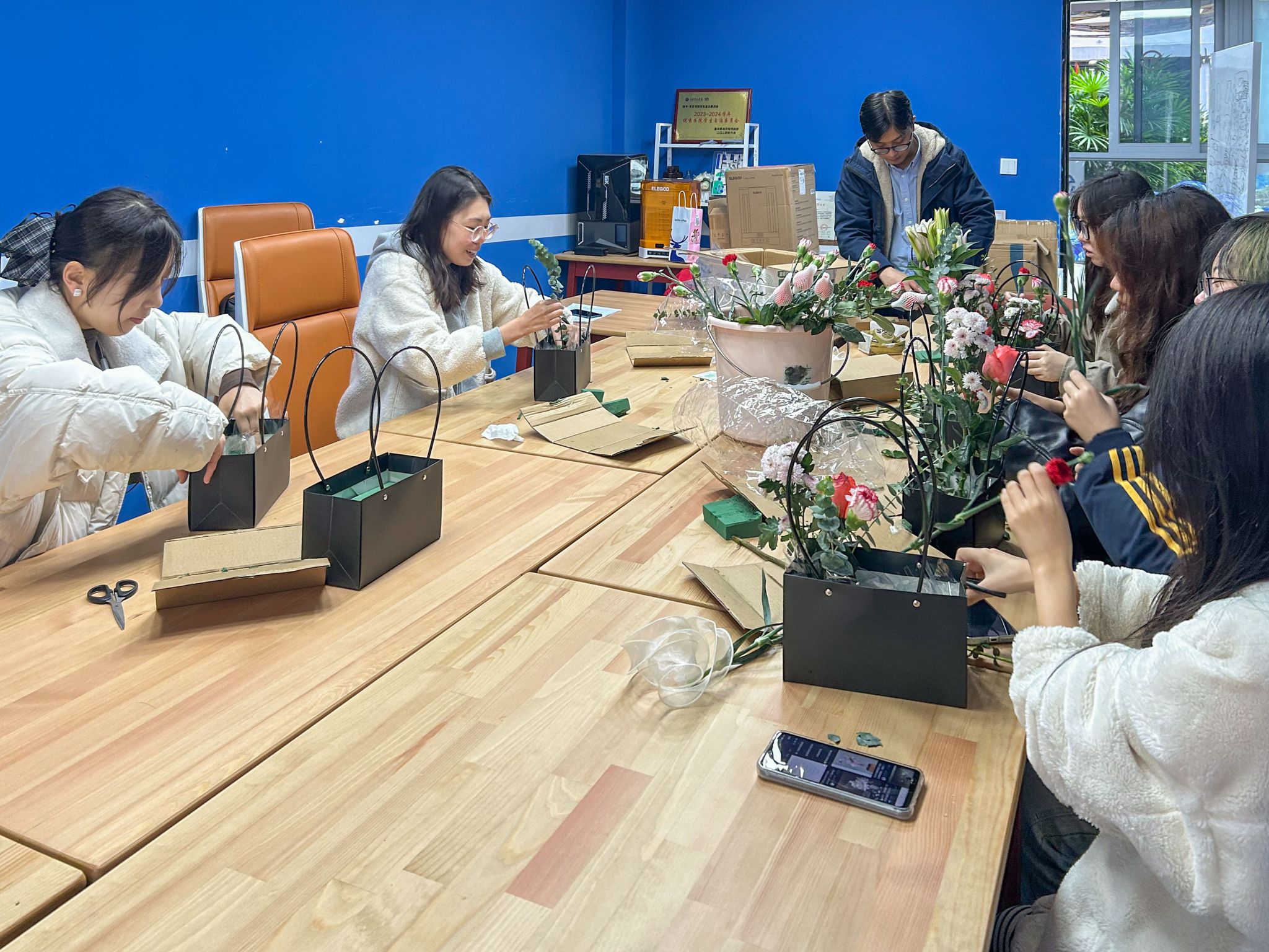 进入实践阶段,各小组积极动手,从花枝修剪到结构造型,在导师的现场指导下不断调整与完善。每位同学都在创作中找到属于自己的节奏,会议室内花香与笑声交织。作品展示环节中,学生从灵感来源、创作过程、色彩表达等方面分享心得,在交流中加深了对美育价值和跨学科协作的认识。
