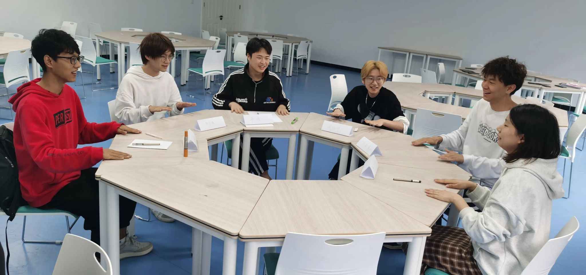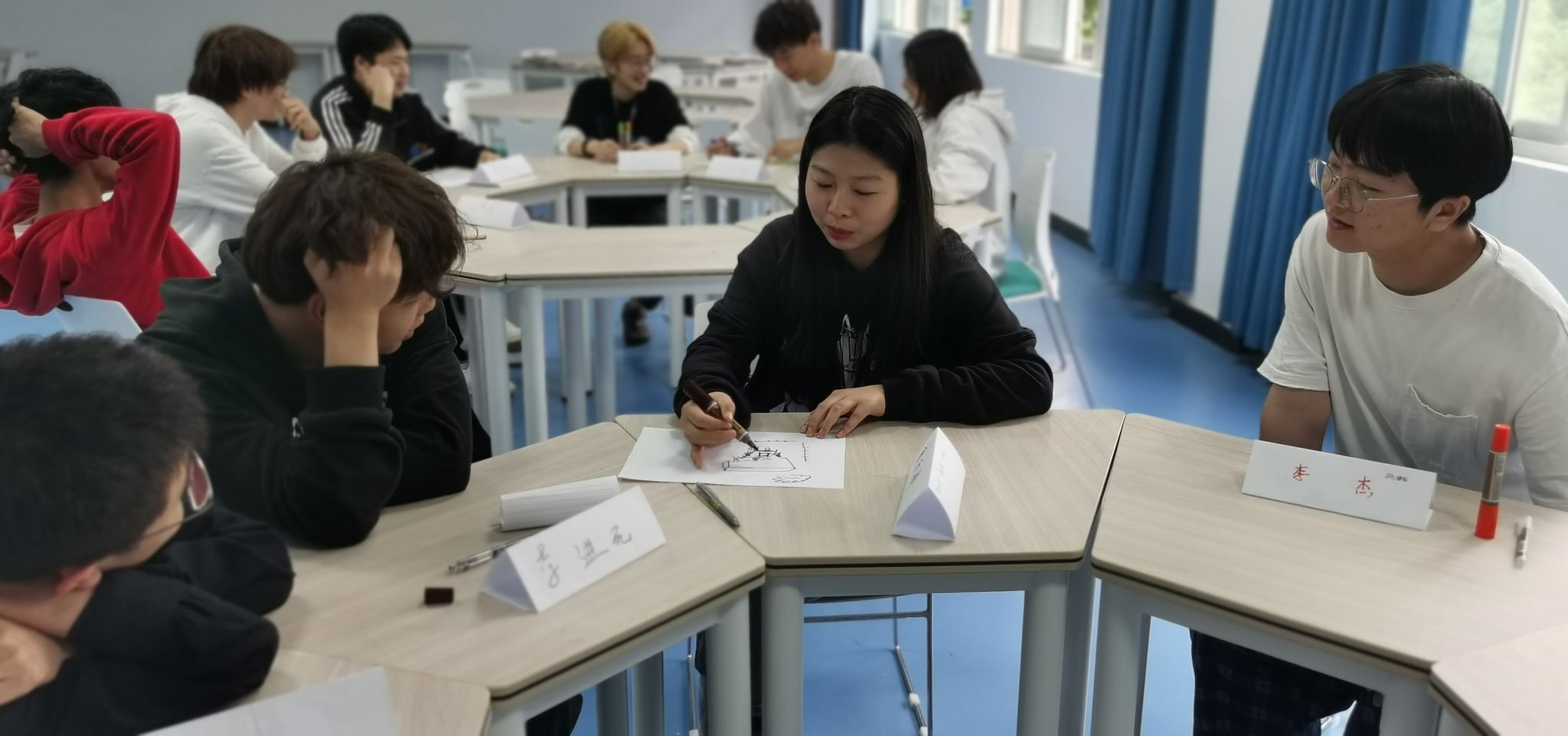 活动气氛愈渐热烈,同学们都积极参与团体活动。卢老师为了让同学们理解团体的重要性,首先对同学们进行分组,小组各成员进行破冰,每人自我介绍并制作自己的座位牌。然后开展了“名字叠叠乐”、“我型你秀”等几个团体小游戏,各小组分别展示属于自己的画作。最后卢老师让同学们思考:我的生命的意义。