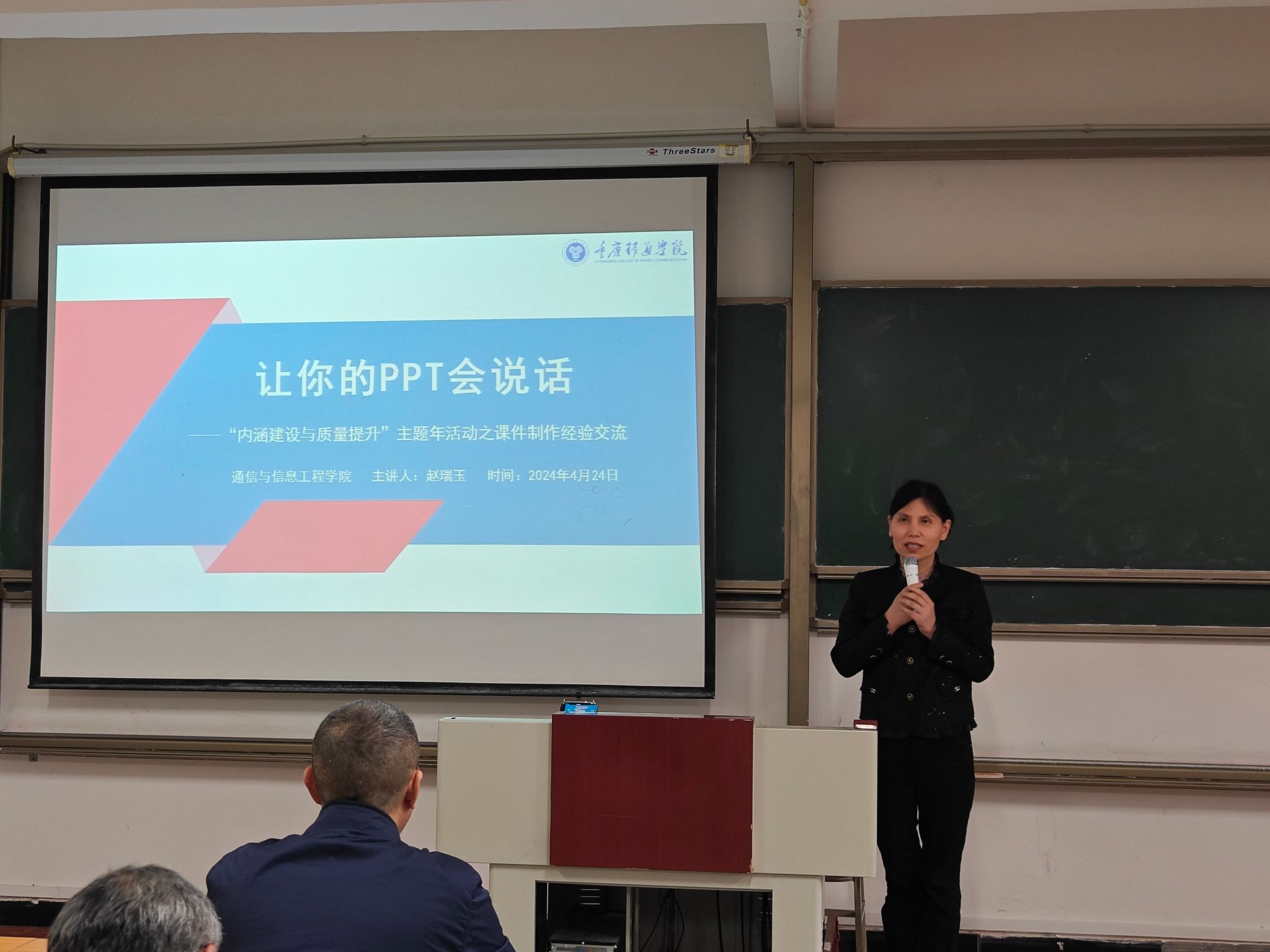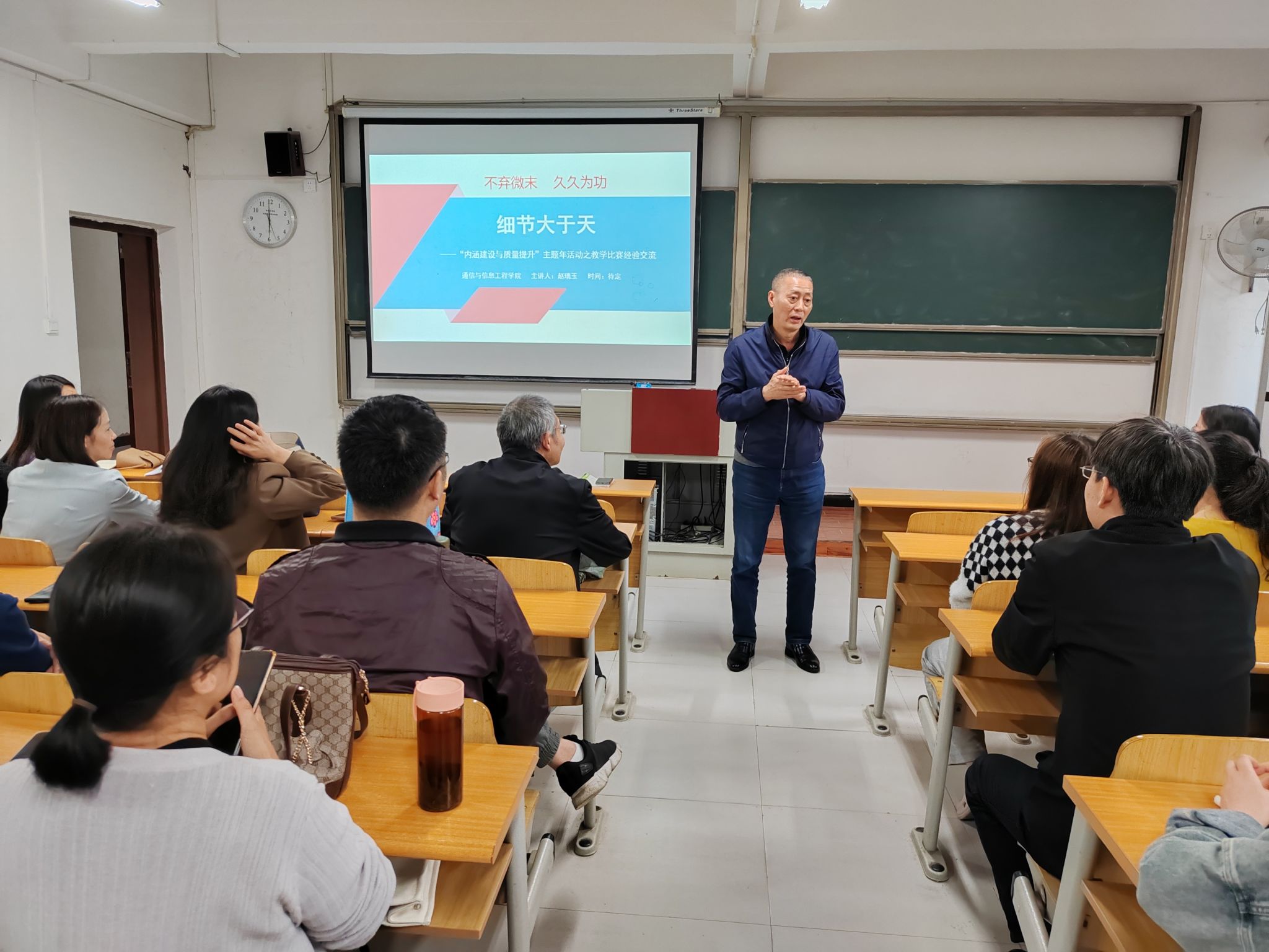 课件作为现代教学中的重要工具,其设计和制作的质量不仅关系到教学效果,更直接影响着学生的学习体验。为进一步提升教师的课件制作水平,打造“以学生为中心”的优质课堂环境,通信与信息工程学院于4月24日在7307教室开展了课件制作经验交流活动。此次活动由唐林建副院长主持,学院全体教师参加,并特邀了在教学领域拥有丰富经验和深厚专业知识的赵瑞玉教授作为主讲人,为大家带来了一场精彩纷呈的分享。