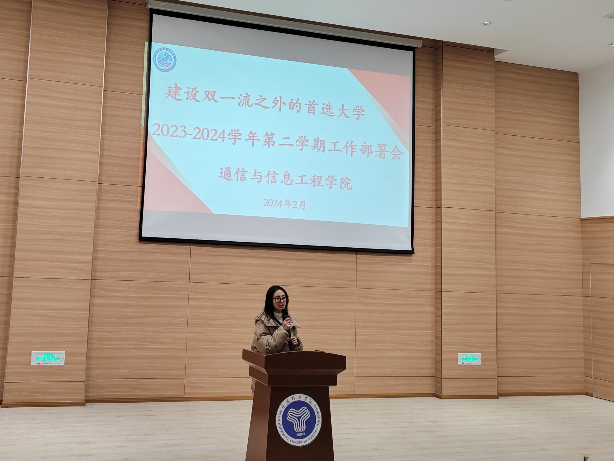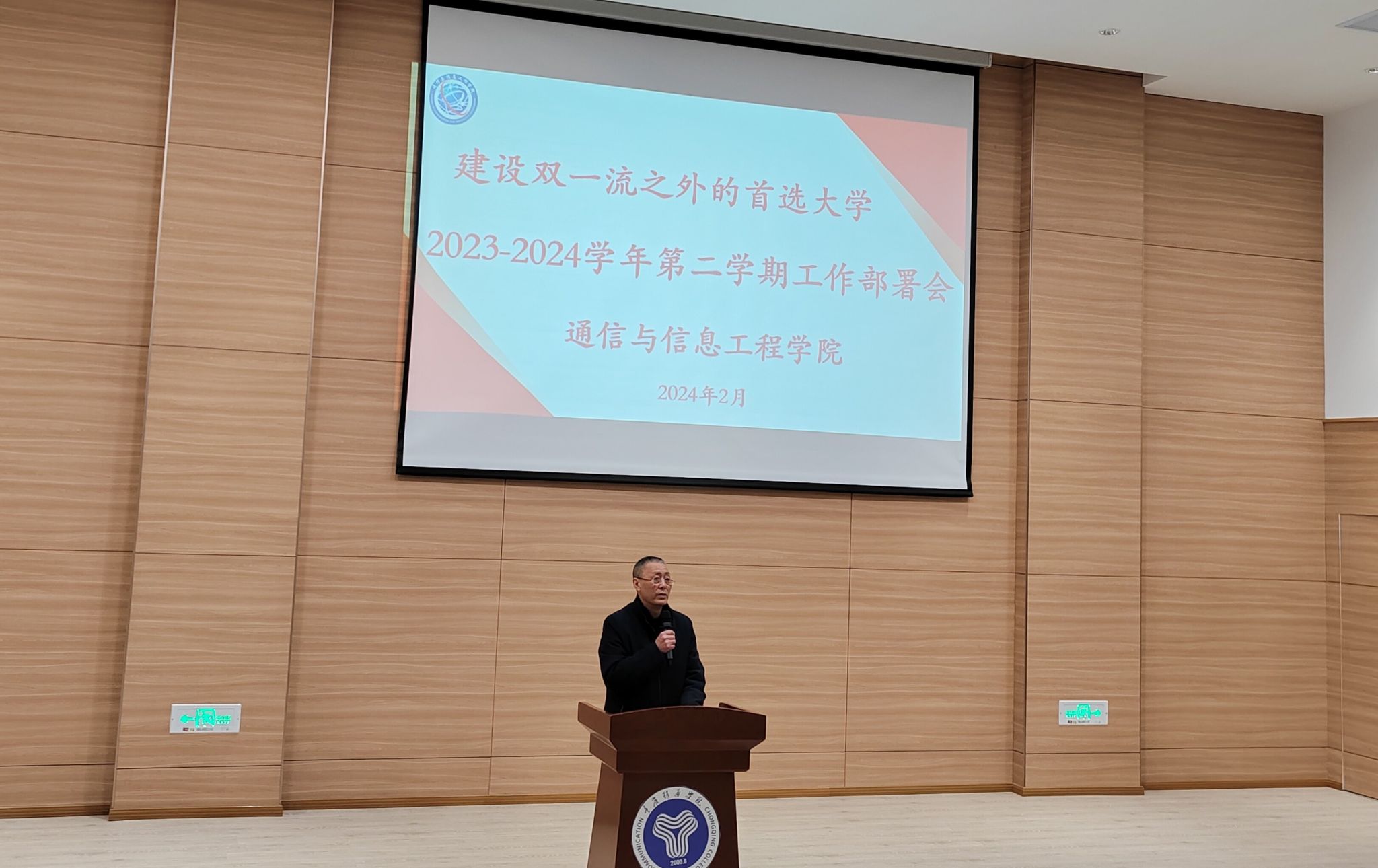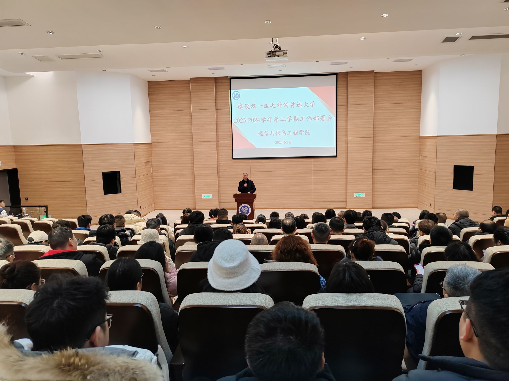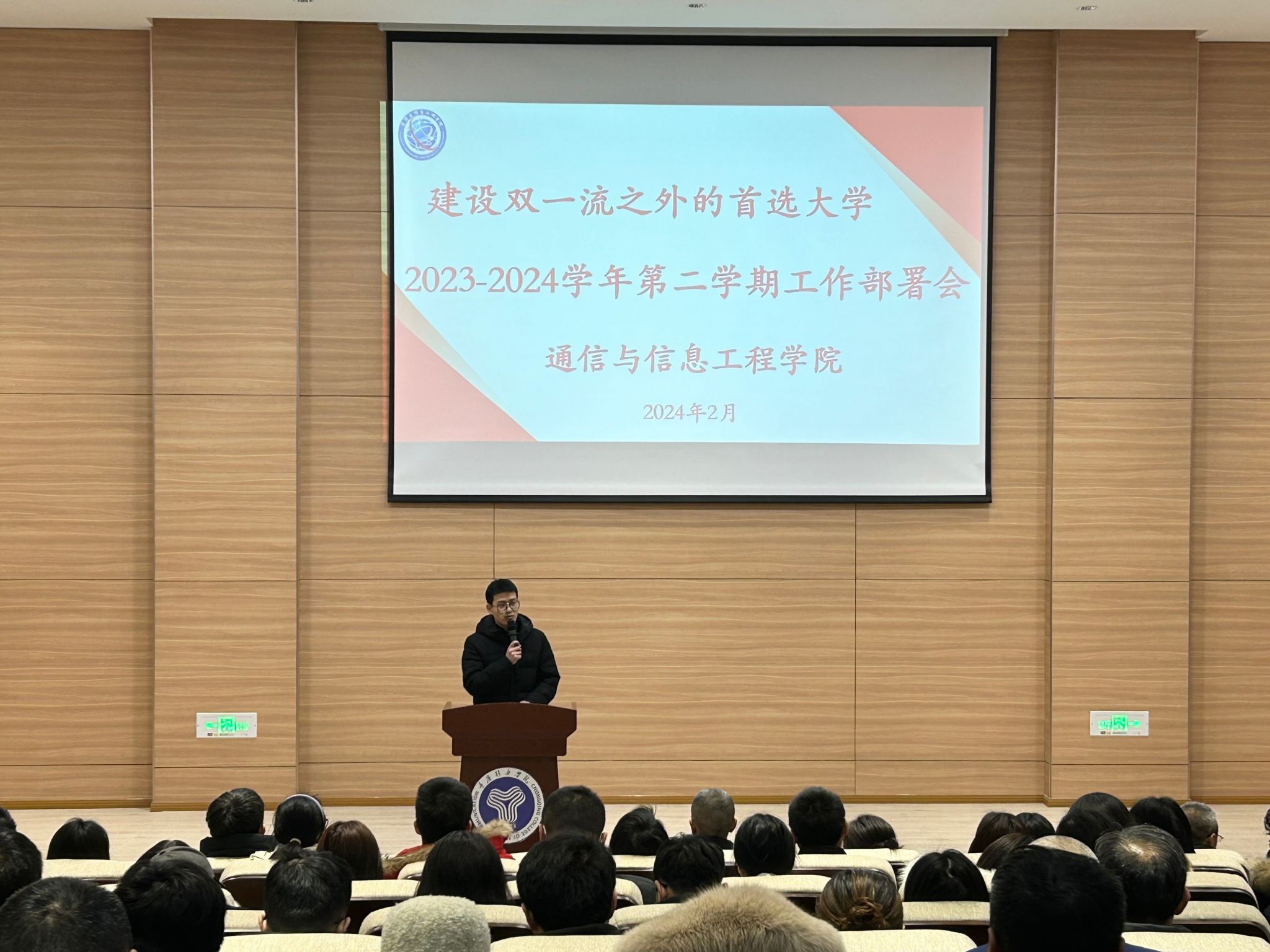 为贯彻落实董事长在2024年年会上的讲话精神,明确新学期的工作方向和目标,确保各项工作顺利进行,2月28日下午,通信与信息工程学院在六度空间创梦空间召开了2023-2024学年第二学期工作部署会,回顾总结2023年工作成绩,安排部署2024年学院重点工作。本次会议由教学副院长唐林建主持,学院全体教师参加。