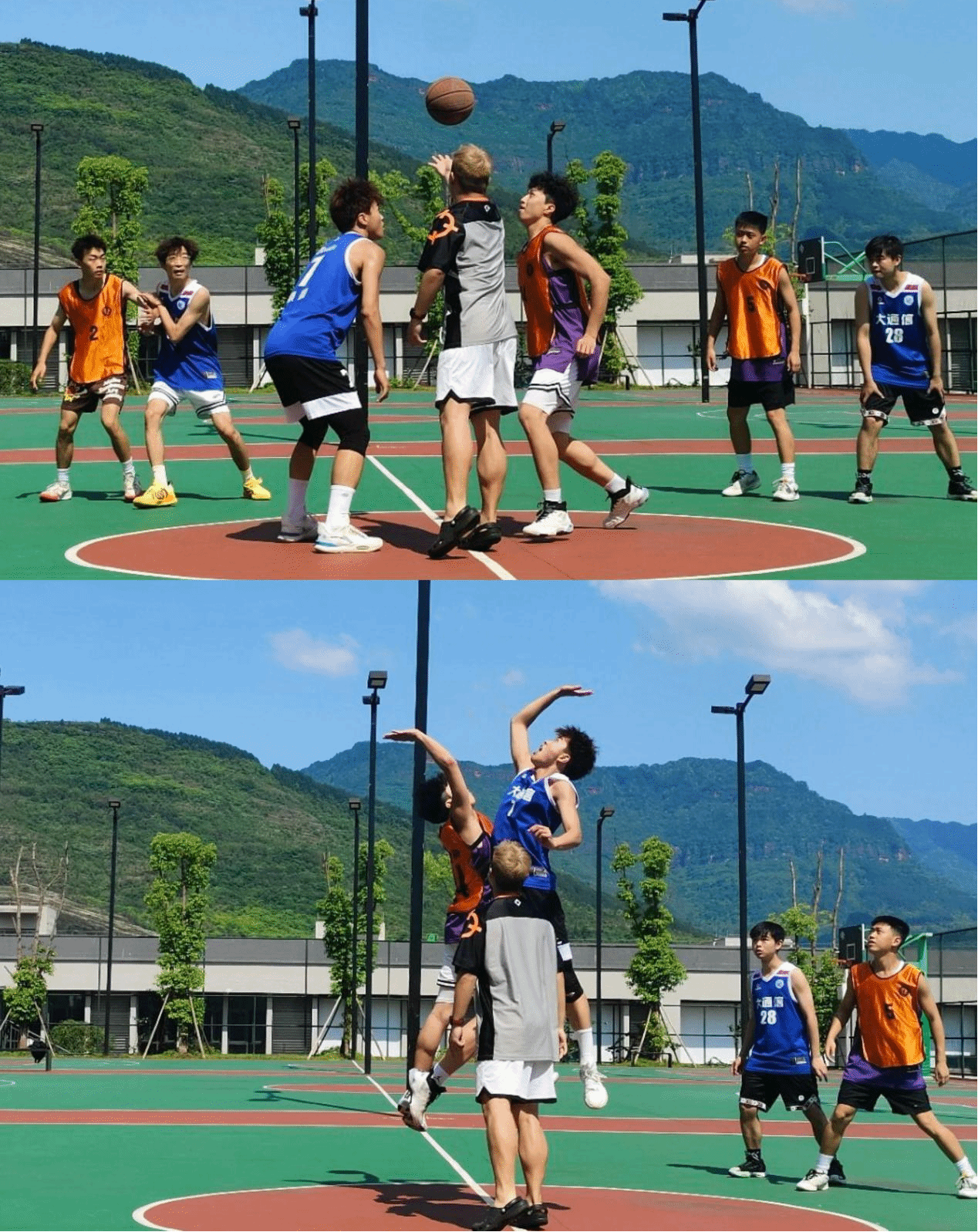 当球与争球队员的手接触的那一刻,计时开始,比赛也正式开始。球场上的气氛轰然高涨,球员们全神贯注的投入比赛中,气氛逐渐变得热烈而紧张,球场上只剩下观众们的欢呼雀跃声、篮球与地面的碰撞声、球员们跑动时鞋子与地板的摩擦声。他们时而快速突破,时而精准投射,时而巧妙传球,时而顽强防守,每一次进攻和防守都充满了紧张与刺激,共同最求更高、更快、更强的自己。