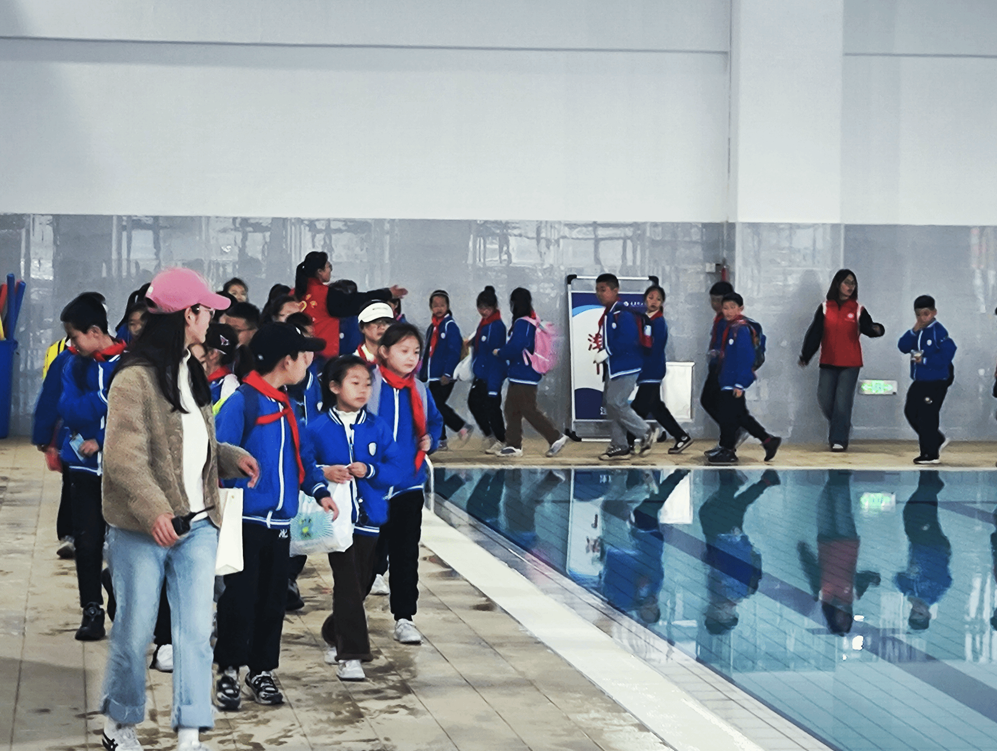“哇喔~”行进至游泳馆,小小体验官们用此起彼伏的低吼声表达内心的期待与激动!带队老师介绍到,游泳课是移通学子的全员“必修课”,移通学院拥有市内同类高校第一个恒温游泳池,旨在打造全员会游泳的大学,非体育类院校最体育的大学。