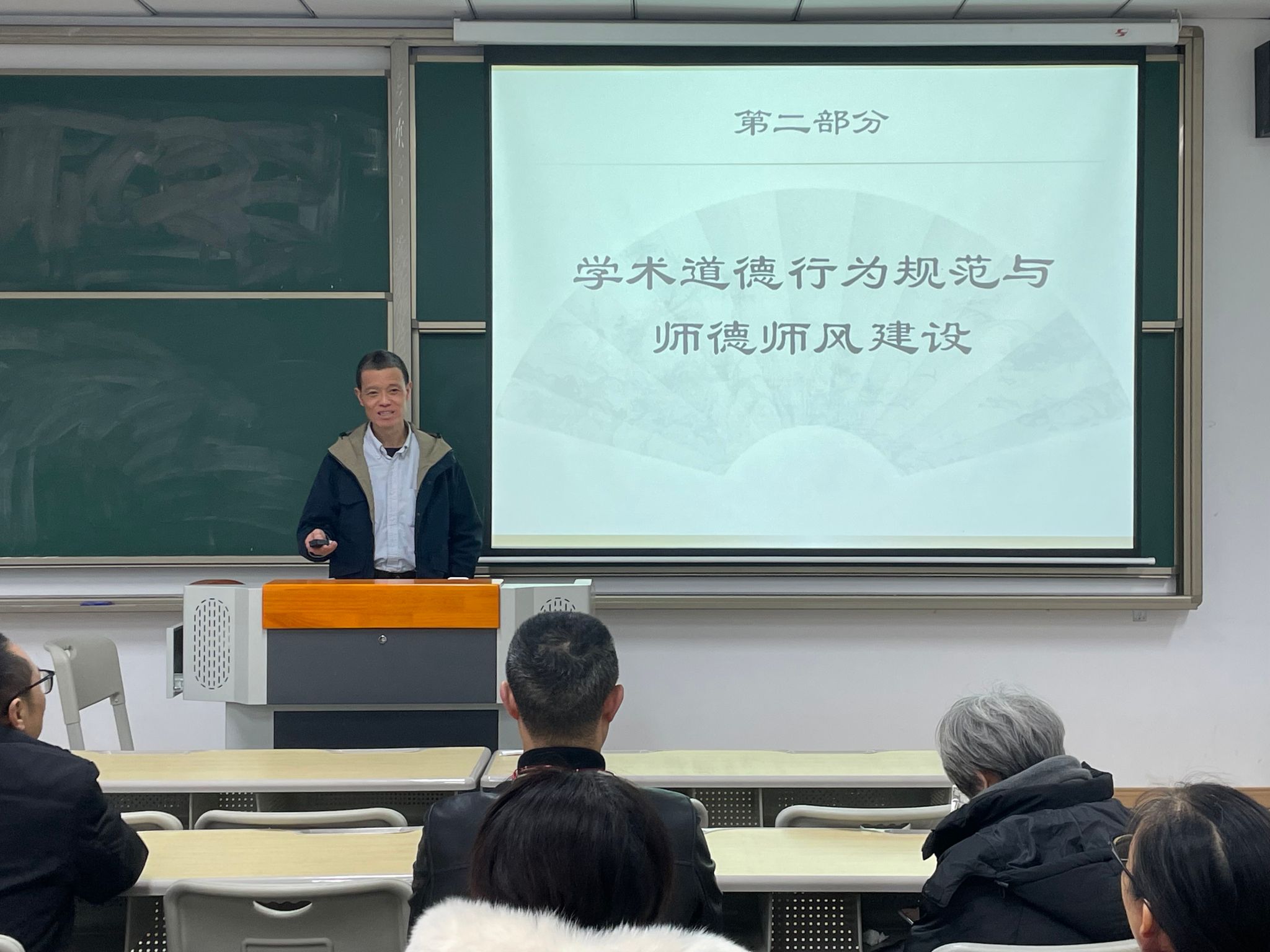 接着,专任教师徐晓副教授做了《学术道德行为规范与师德师风建设》的报告分享。他详细阐述了在教学和科研活动中应遵循的一系列行为准则和规范,包括学术诚信、尊重知识产权、避免抄袭和剽窃等方面。徐晓老师还对学术道德失范的界定进行了深入解读,并强调了高校教师的师德师风建设的重要性。他结合自己的个人体会,呼吁教师树立正确的学术价值观,坚守学术道德底线。