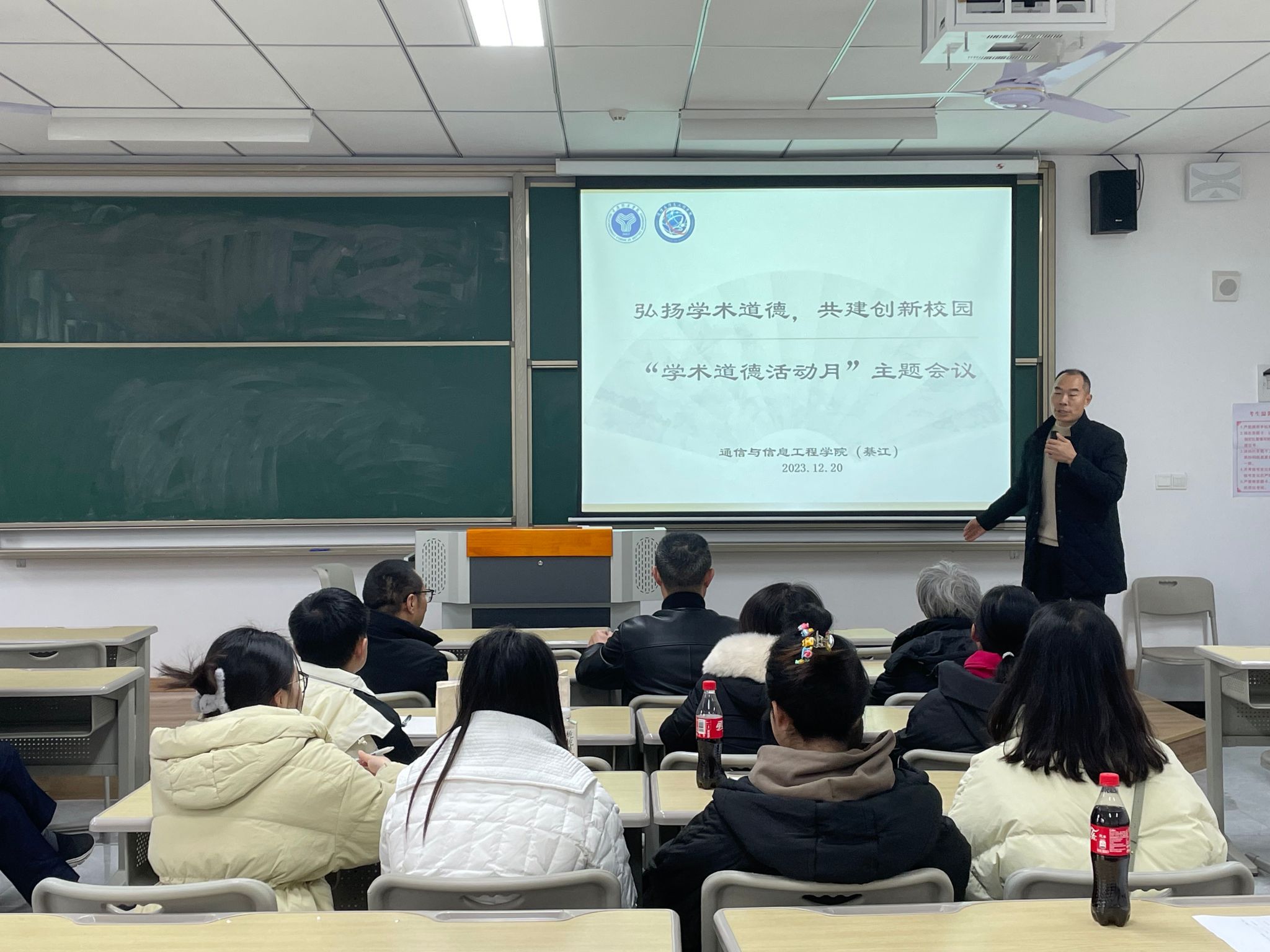 为进一步加强学院教风学风建设,营造良好学术生态,引导学院教师增强恪守学术道德规范的思想自觉和行动自觉,全面提升教师教学素养,通信与信息工程学院于2023年12月20日下午四点,在行者楼103召开了“弘扬学术道德,共建创新校园”学术道德活动月主题会议。
