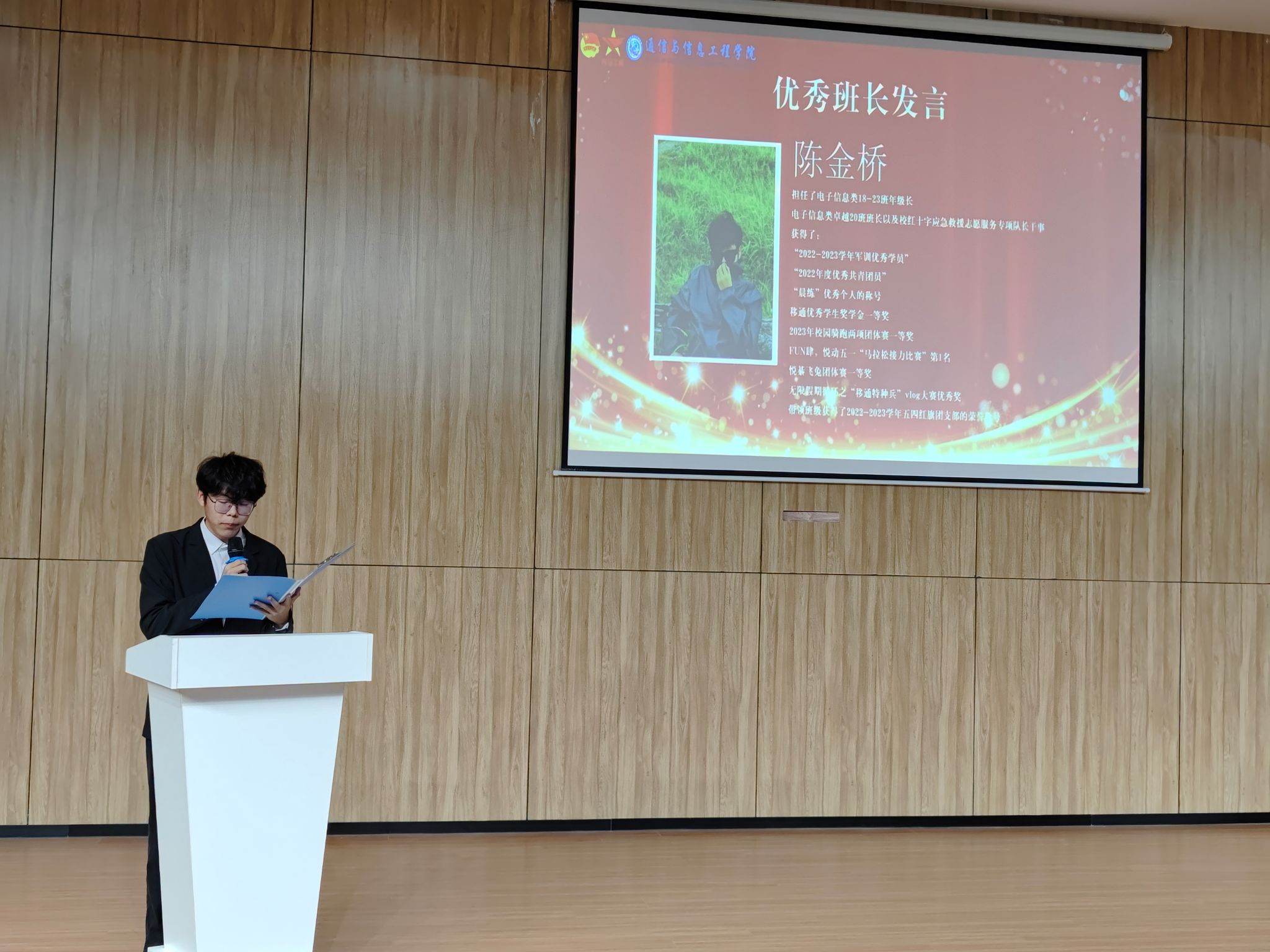 “少年不惧岁月长,彼方尚有荣光”,陈金桥学长作为第五期优秀班长代表发言,他讲述了曾在青马之路上的收获和感悟,引导同学们应树立远大理想,不因“空山不见人”而乱心智,不应花言巧语而迷失方向,坚持律己修身,甘于在平淡的工作中积极作为,以平常心对待个人进取退得失,牢记使命担当,努力做一个时代需要的青年人 ,让青春年华在为国家,焕发出绚丽的光彩!