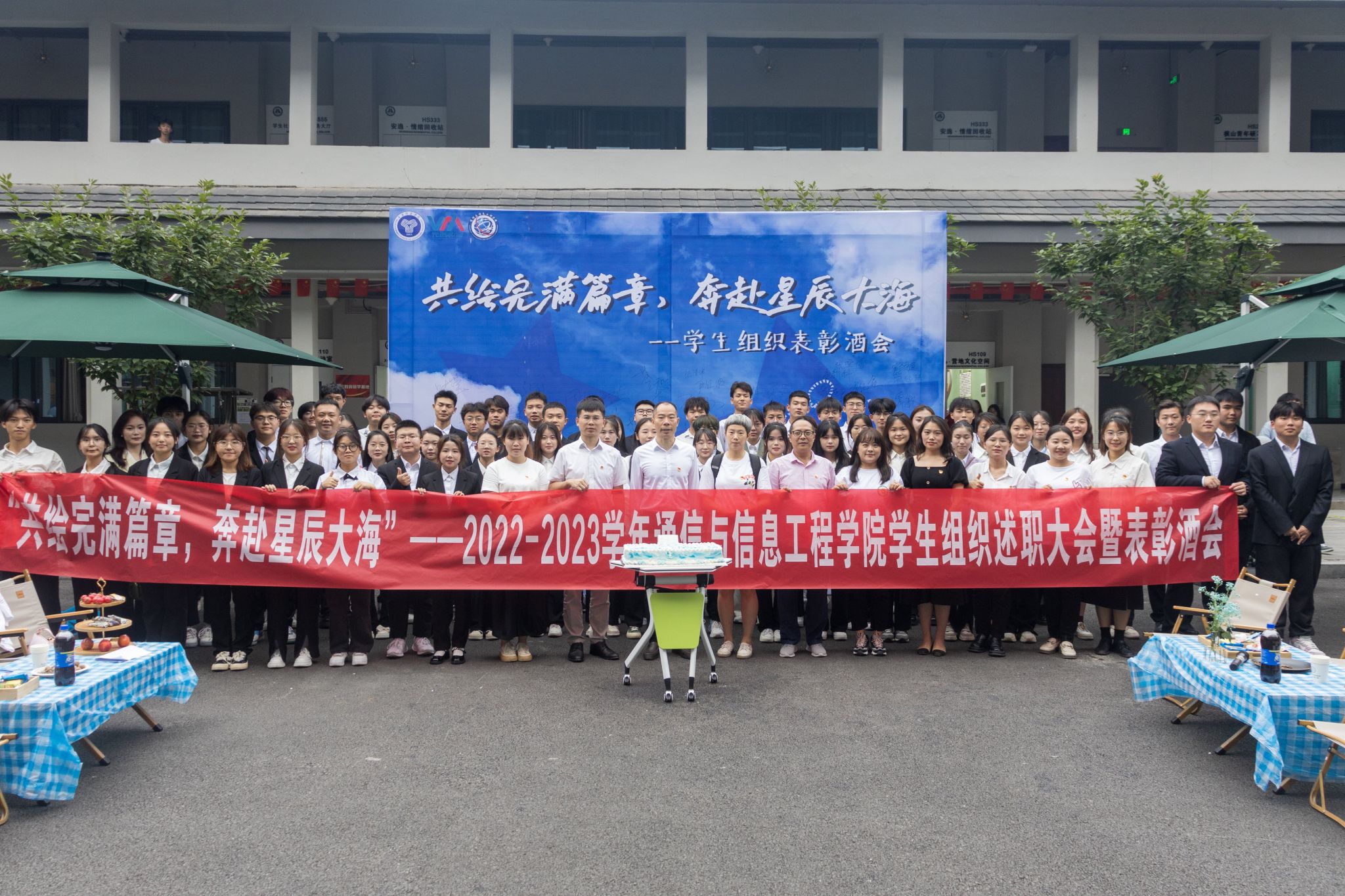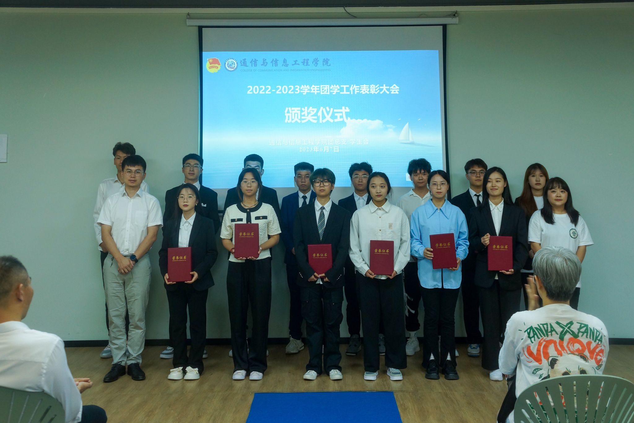 为总结交流本学年团学工作经验,表彰在工作中表现优秀的团学干部和干事,有效调动团学工作的积极性,以及衷心感谢大家在过去一年的辛勤付出。2023年6月7日18:00,通信与信息工程学院学生组织表彰大会暨表彰酒会在横山书院中庭和知物·多功能活动室顺利进行。通信与信息工程学院副院长王国树老师、学工办主任周俊老师、团总支书记田海燕老师、专任教师田凌燕老师和莫文中老师以及我院全体辅导员和学生代表出席本次大会。
