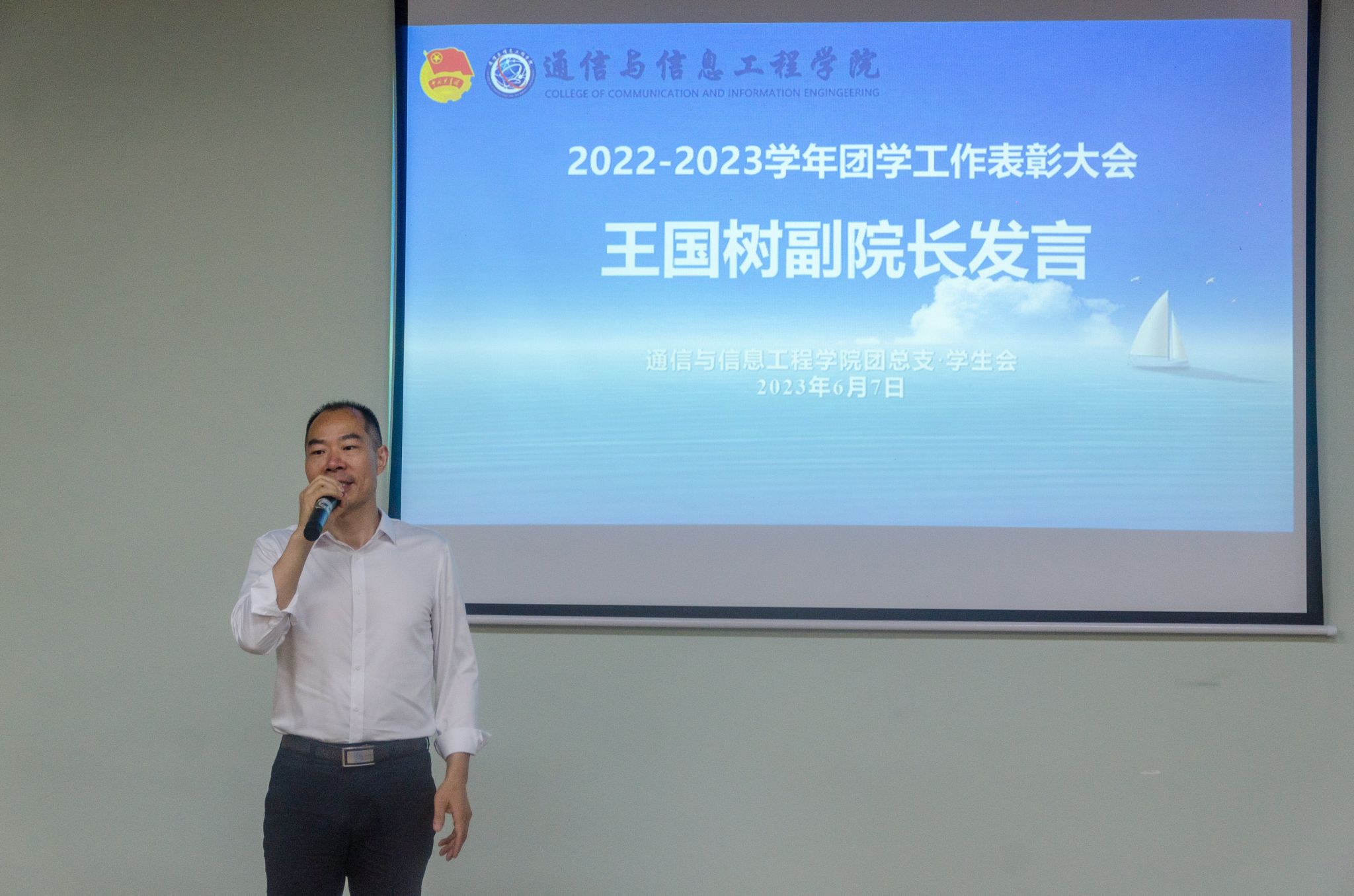 伴随着大家热烈的掌声,通信与信息工程学院副院长王国树老师总结发言。王国树副院长表示很荣幸能参与此次表彰酒会,也肯定了在过去一学年的相关工作,并期望我们继续主动作为,守正创新,不辜负学校对我们的厚望和信任,团结一心,携手共进,砥砺前行。