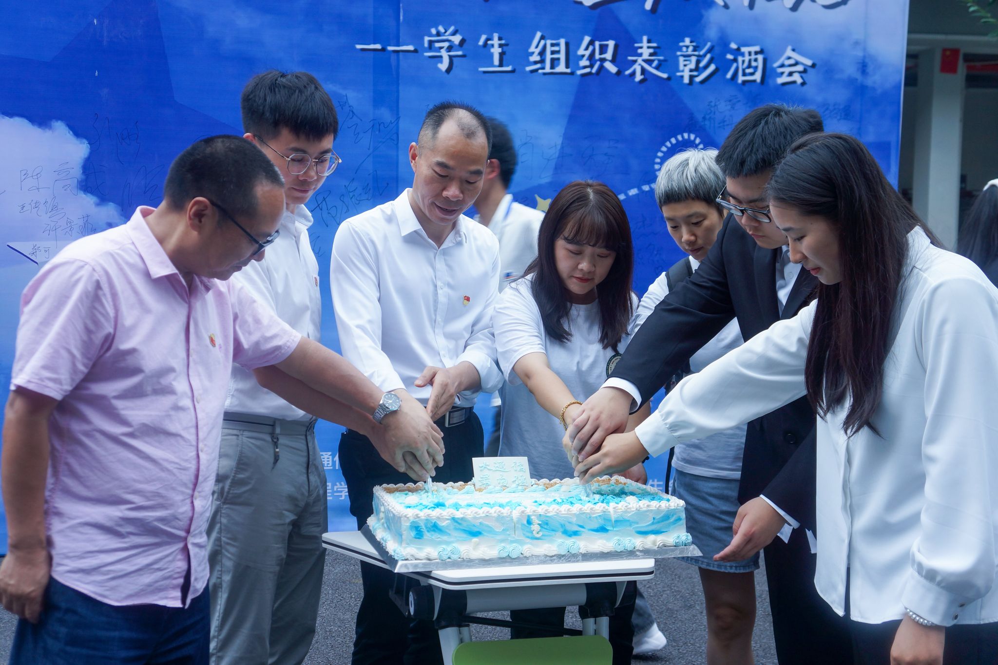 表彰大会结束后,大家井然有序移步到横山书院中庭进行表彰酒会。酒会上,全体老师上前共同切开蛋糕,并和学生代表们合影留念。