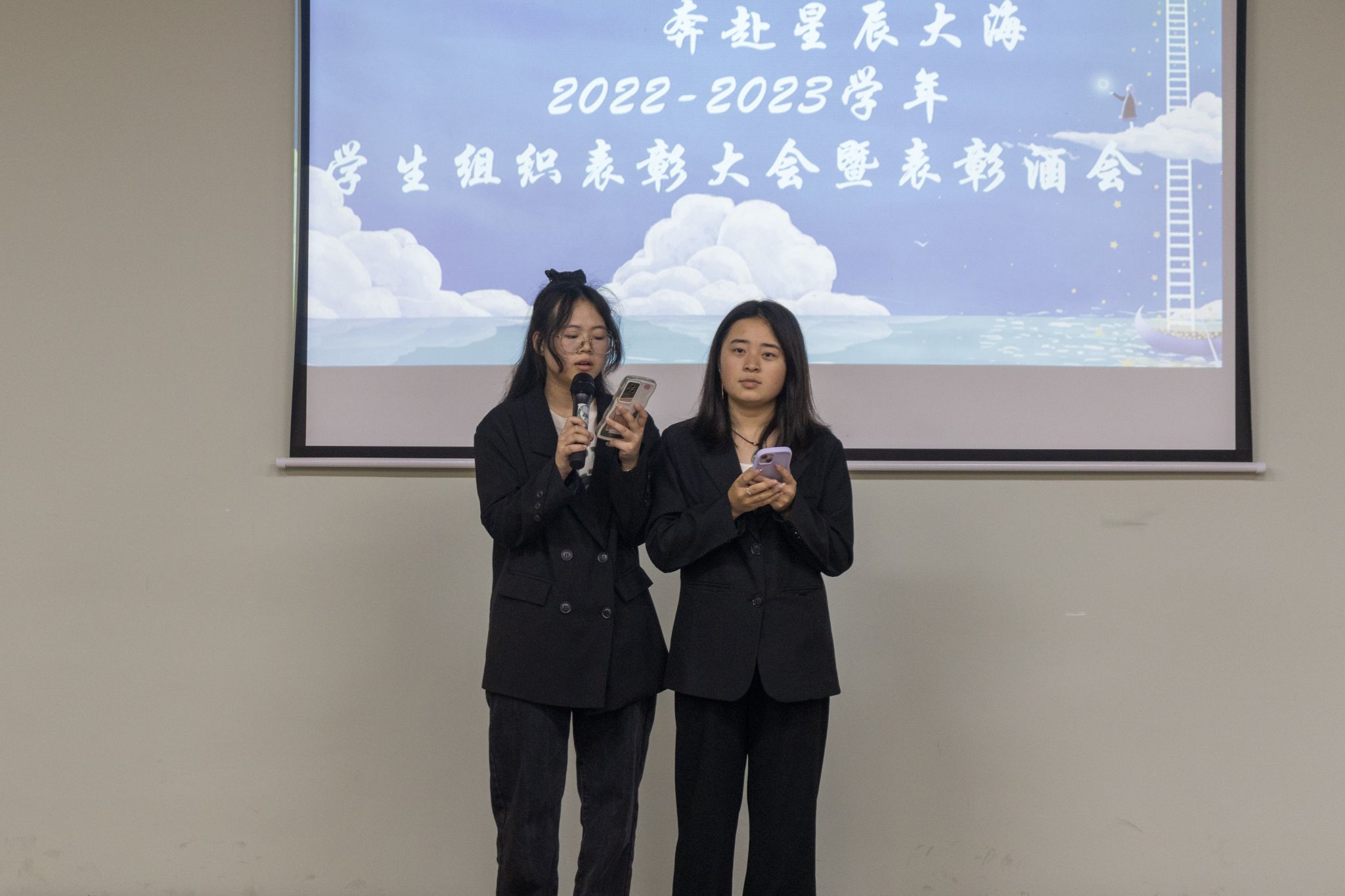 笑容中带着泪花,是总结也是离别。在老师们的见证下,优秀干部干事的名单结果已公示。在大家的掌声中,通信与信息工程学院团总支书记田海燕老师、学工办主任周俊老师为优秀干事代表颁奖;通信与信息工程学院王国树副院长为优秀干部代表颁奖。