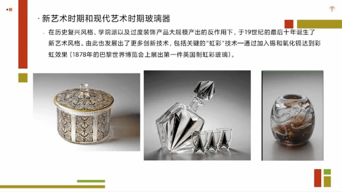 通识教学部罗磊主任,作了“欧美文化中玻璃产品的市场需求”的主题汇报,包括:古典时期的玻璃器、中世纪的玻璃器、文艺复兴时期的玻璃器、巴洛克和洛可可时期的玻璃器、新古典主义和历史复兴风格时期的玻璃器、等内容。中国玻璃产品出海,需要深入研究欧美文化和用户需求,才能更好的让中国玻璃产品融入欧美市场。
