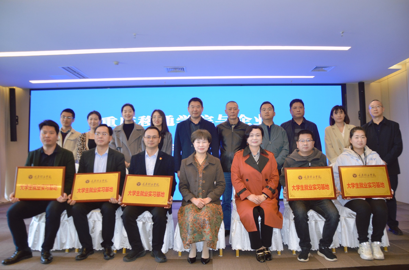 参观完两家公司后,大家来到企业服务中心3楼接待会议室,共同参与了“重庆移通学院调研专题”座谈会。在观看完大足宣传片和我校宣传片后,孙校长着重介绍了我校独特的“四位一体双院制”人才培养模式,培养数字经济时代的高情商经营管理人才这一培养目标得到了在场领导与企业家的一致认可。原双桥经开区管委会副主任吴励表达了加强与学校合作的意愿。她提到:“座谈会上,大足区领导高度重视与高校加强人才引进、产教深度融合、以研促学的各项合作,希望参会企业家也重视与学校的交流与合作,将产教融合落实到实处。”企业代表也在人才发展与培养方面提出了思考和建议,对解决就业结构性矛盾具有重大意义。一方面,公司可以为学生提供实习平台,为培养高水平应用型人才提供有力支撑;另一方面,也希望学校为企业提供人才输送渠道,实现校企互动和双赢。此次洽谈,学校与胜泰光电、宇海科技、达汉电子、中汽院、新双圈公司当场签订校企合作协议并举行授牌仪式。大昶(重庆)电子科技有限公司董事长因行程安排未能莅临现场,但也达成合作,择日签约。
