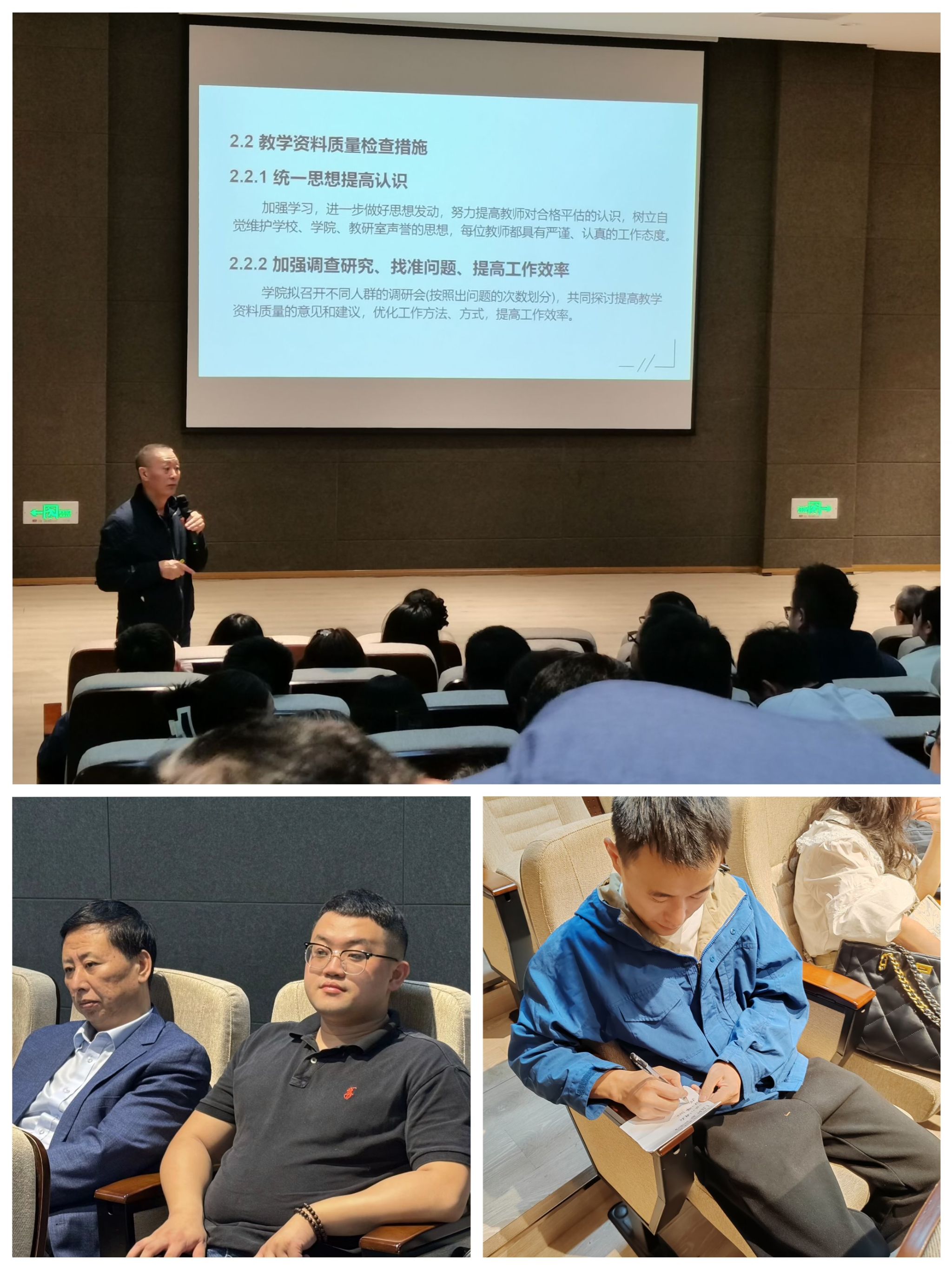 会议伊始,唐院长对学院内部的两次随机抽检、学院间的交叉检查以及校级督导的抽检,共计四次检查结果进行了全面而细致的统计与深入的数据分析,将每次检查暴露的问题进行了剖析,并提出中肯的改进意见,同时对每次不规范的比例进行比较,表扬了在四次检查中均未出现问题的老师,看到了教学资料规范的工作效果,也对在检查中问题较多的进行了警示。他强调,尽管教学资料的质量检查工作已取得了一定成效,但整体提升幅度尚显不足,成效尚待加强。他鼓励全体教师向教学资料规范的优秀老师学习,借鉴他们的优秀做法与严谨态度,以期共同推动教学资料质量的全面提升。