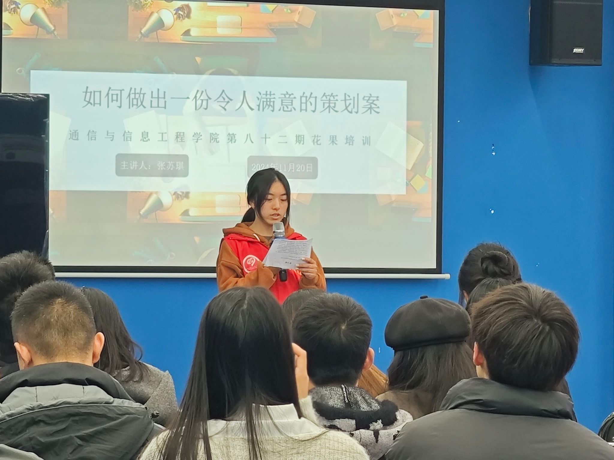 为提升大学生志愿者开展志愿活动的策划能力和团队协作水平,确保志愿活动能够更加顺利和高效地进行,特此举办本次策划培训活动。2024年11月20日下午13:00到14:00,通信与信息工程学院青年志愿者协会与“伐木累”通信学院志愿者培训志愿服务专项支队共同举办的“智策启迪·慧划未来”策划技能培训会于天空书院・揽江厅师生交流室顺利开展。此次活动由花果培训骨干班全体成员参与,共计50余人。