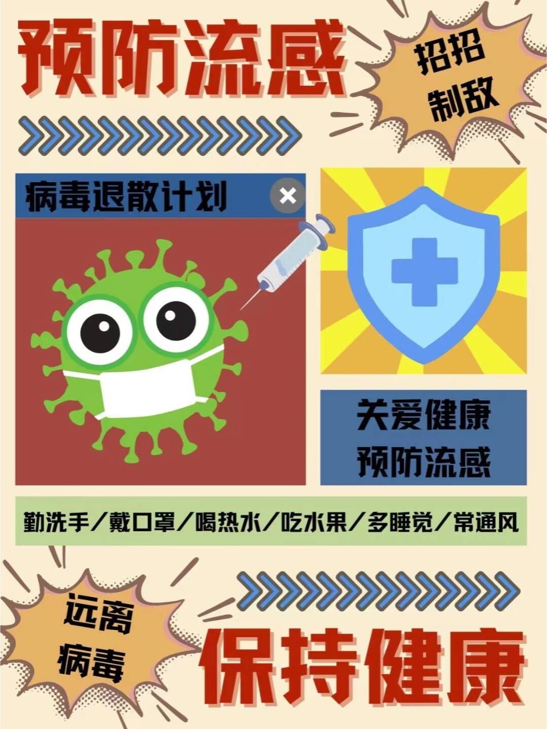1.春季是流感的高发季节,常见的春季传染病如:流行性感冒、诺如病毒、流行性腮腺炎等,而返校途中更是容易感染流感病毒的场所之一,在旅途中,要佩戴口罩、勤洗手、保持社交距离等措施。