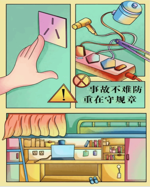 5.遵守宿舍用电规定。宿舍内严禁使用大功率违规电器,如电炉、热得快、电暖器等,这些电器容易引发火灾。同时,不要私拉乱接电线,离开宿舍时要关闭所有电器电源,拔掉插头,养成良好的用电习惯。