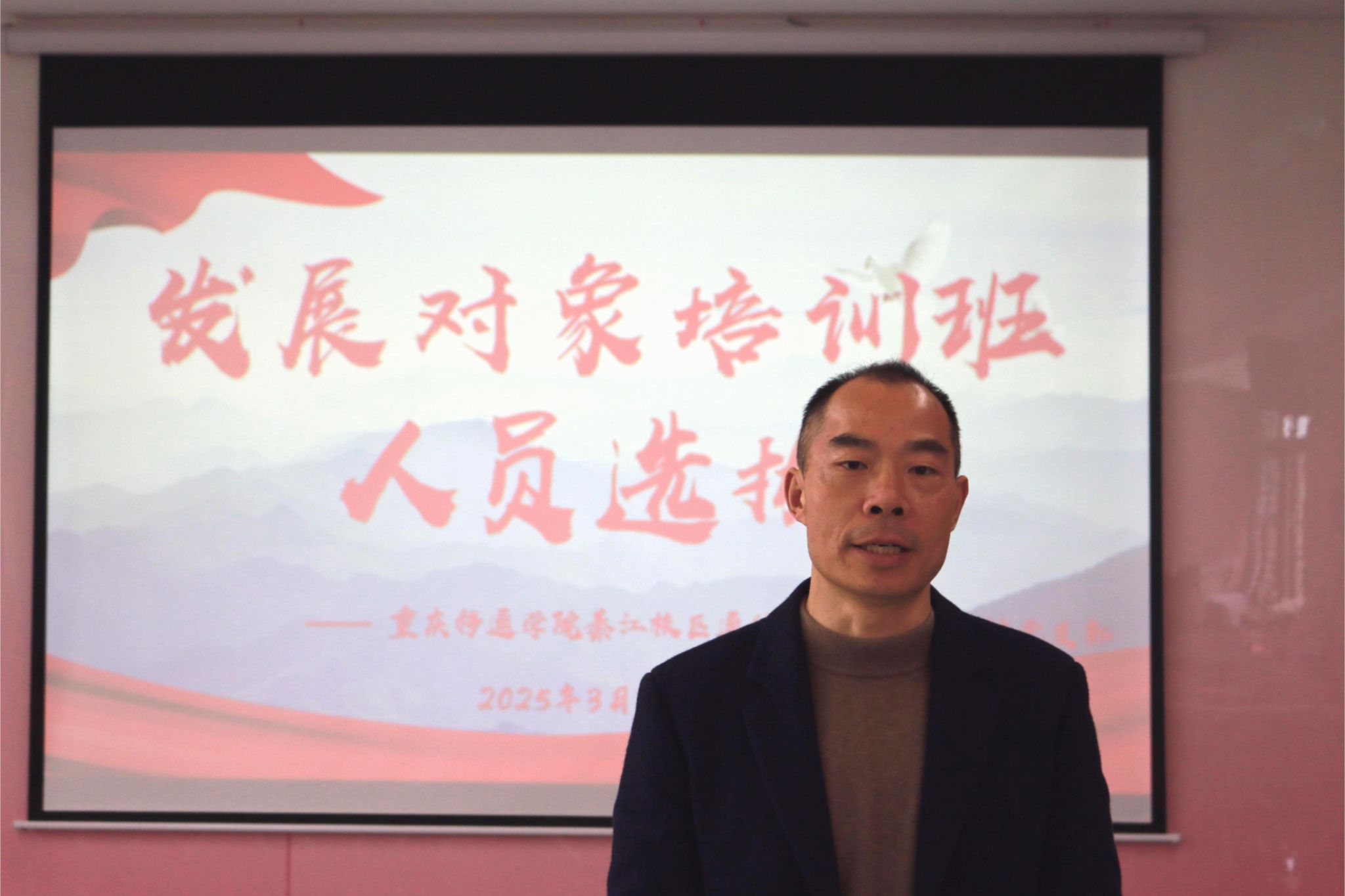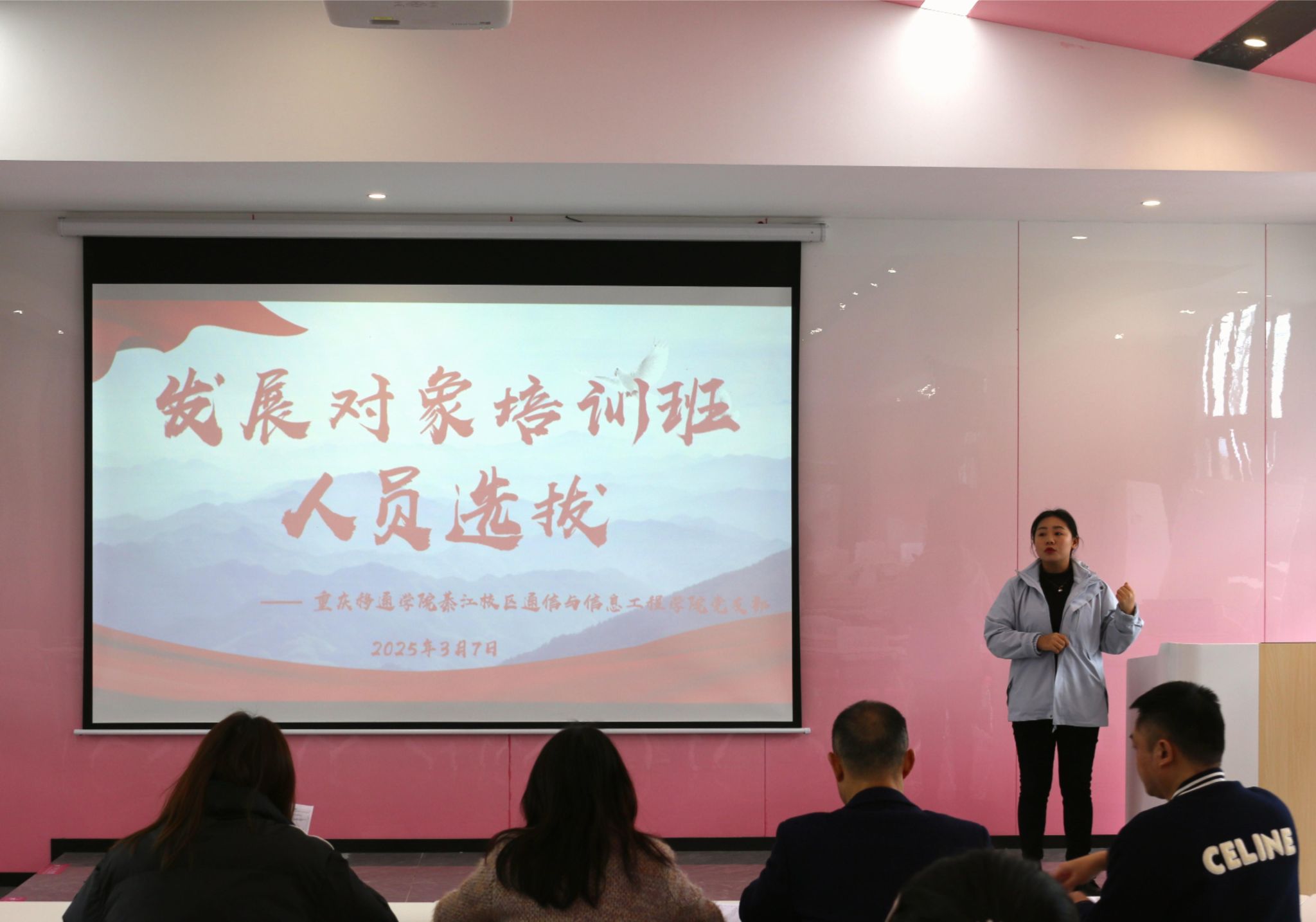 为规范党员发展程序,选拔政治过硬、思想坚定、表现突出的入党积极分子进入发展对象培训班学习,重庆移通学院綦江校区通信与信息工程学院党支部于2025年3月7日中午12:30分在丁山书院天蝎座多功能教室举行2025年上半年发展对象培训班人员选拔答辩。党支部书记、学院副院长王国树老师,团总支书记田海燕老师、学工办主任胡戈立老师及党员教师作为评委出席,对16名优秀的入党积极分子进行全方位考评。