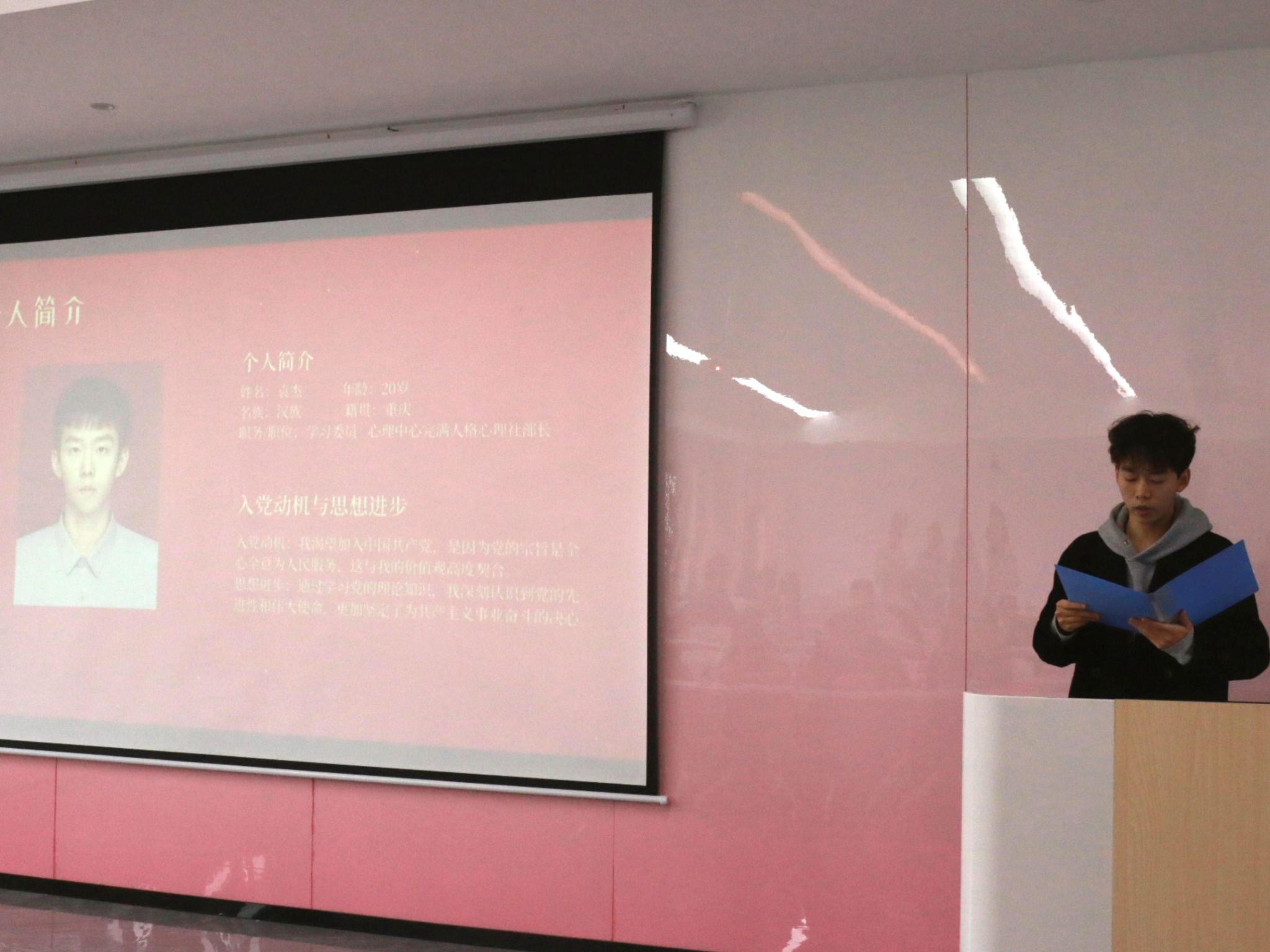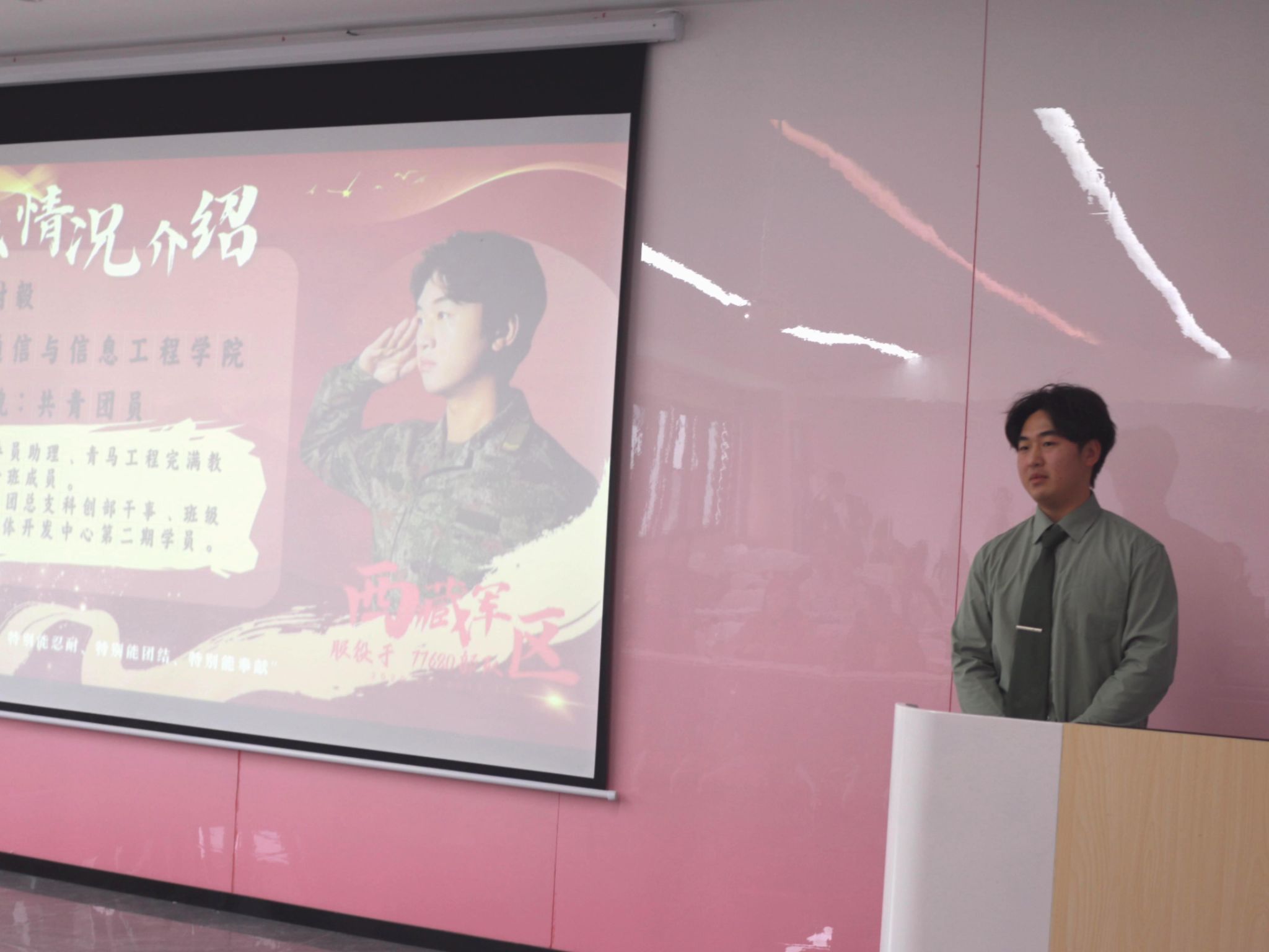 在答辩现场,各位同学用PPT的形式进行现场陈述,依次进行个人展示。通信工程专业卓越7班的吴艺同学通过讲述自己在校以来的丰富经历和家庭三代人的红色传承,展现了自己坚定入党的决心和毅力;来自通信工程专业志向1班的封毅同学以“雪山哨所淬炼信仰”为主线,讲述戍边经历中感悟的“特别能吃苦、特别能战斗、特别能忍耐、特别能团结、特别能奉献”老西藏精神,铿锵誓言令人触动万分;还有来自电子信息工程专业志向1班的贺茂峰同学则以专业排名的优异成绩与各项荣誉诠释了自己如何用实际行动践行入党初心的青春答卷。在场的老师和同学自信听着各位同学的陈述,深深感受到大家从入校的两年来所付出的努力以及收获到的丰富成果。