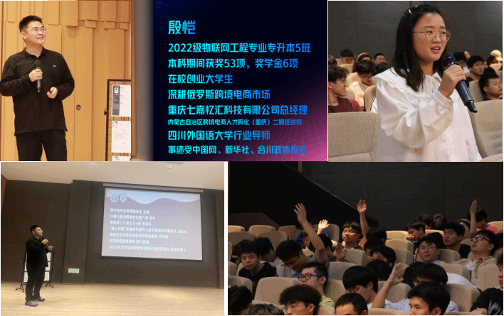 当同学们参与学校的完满活动,收获到新鲜感、成就感的同时可能也会迷茫,为什么一定要参加这么多活动呢,这些东西最终能带给我什么呢?有这个时间我躺寝室打游戏不香吗?或许一边想要进步一边又想要缩在舒适圈的矛盾想法经常在心里产生。而今天我们邀请到一位专升本学长,他来到学校一年时间修读了1000学分,一年多的时间获奖53项,奖学金6项,参加十几个校内组织,并开始了自己的创业之旅,深耕俄罗斯跨境电商市场,创立重庆七嘉忆汇科技有限公司担任总经理,事迹受中国网、新华社、合川政协报道,他就是殷恺学长。殷恺学长从为什么要专升本,来到学校后的收获、转变款款而谈,让同学们都聚精会神的倾听这位有着同样经历的学长是怎么冲出重围,超越自己花1年的时间成为创业的资深人。