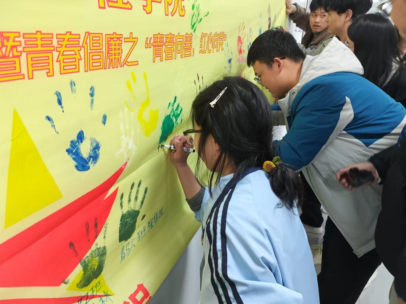 “聚是一团火,散是满天星”。活动最后,学员们在“青马工程”暨青春倡廉的横幅上印下了手印并写上了姓名,标志着学员们志愿成为新时代青年马克思主义者,廉洁奉公,勇担使命。学院组织部指导老师余洋在点评时特别指出:“这些手印不仅是对党的承诺,更是对未来的责任担当。”