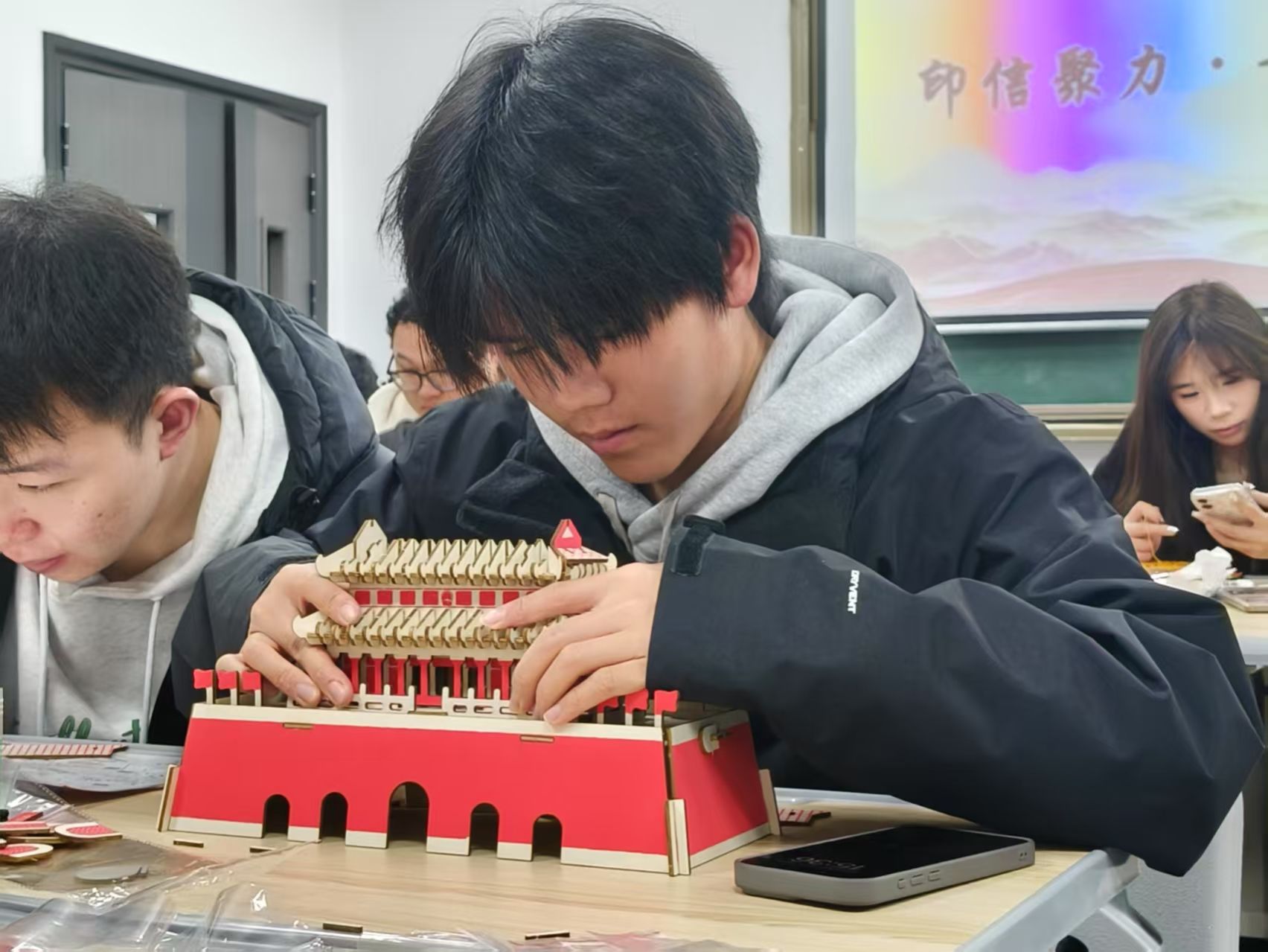 在“非遗传承工作坊”,学员们以北京天安门、天坛等红色地标为蓝本,通过拼图还原党的百年奋斗重大成就;以木板为画卷,用铜丝锤打出象征民族复兴的“中国心”图腾。其中,吕同学分享道:“我们用432根黄线勾勒出五角星轮廓,189颗白线镶嵌出长城纹样,寓意着在党的领导下,56个民族凝聚成不可阻挡的复兴力量。”